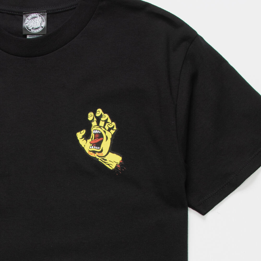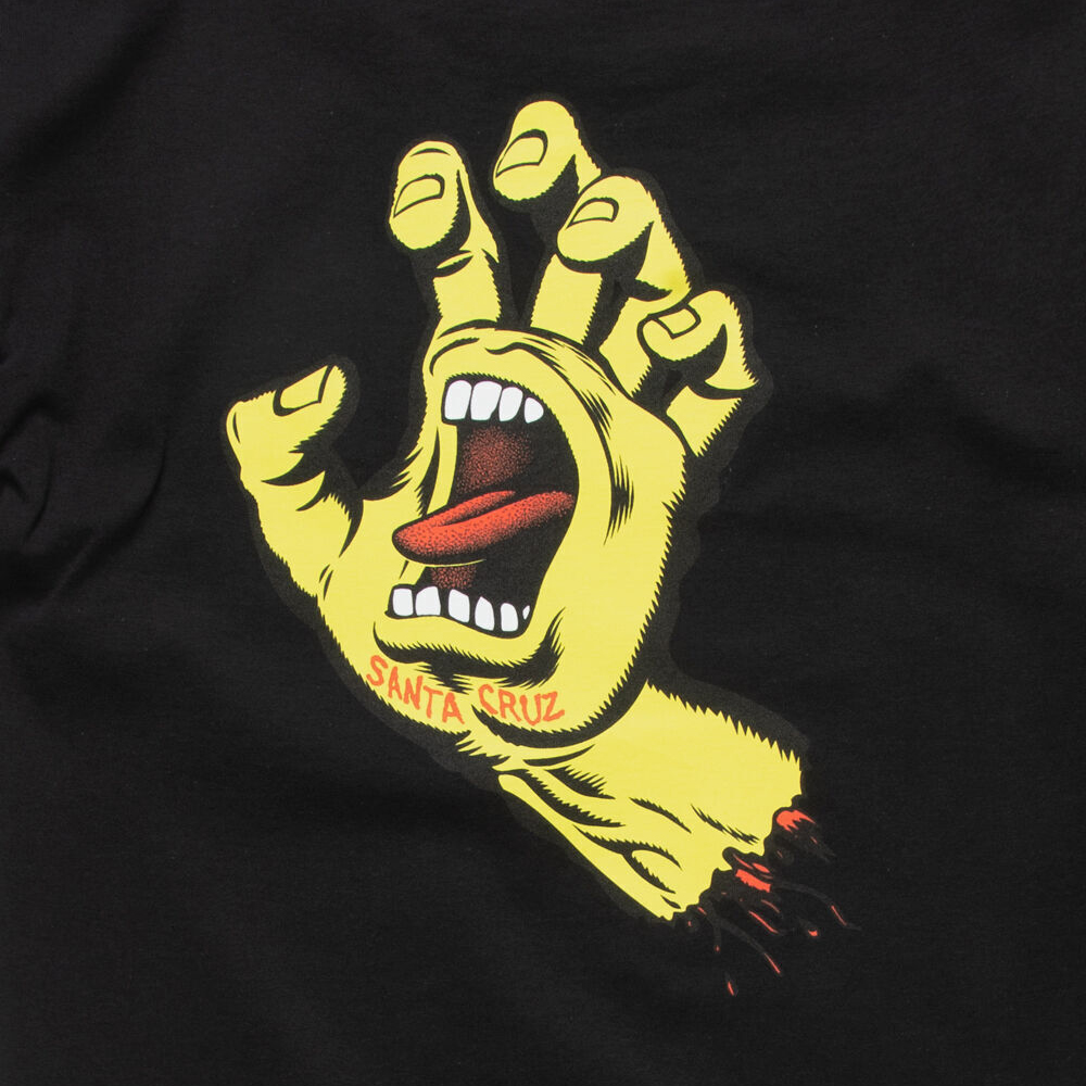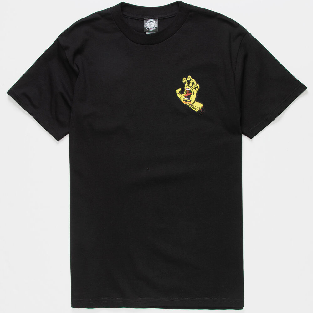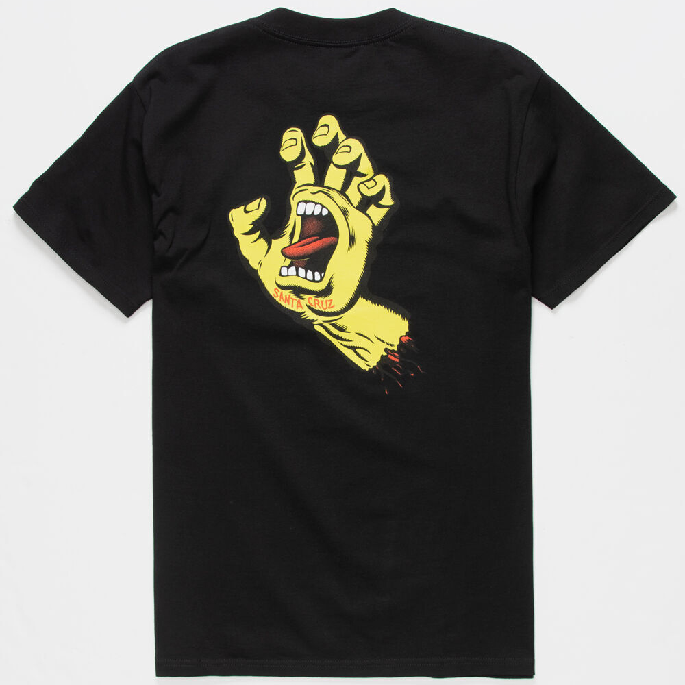 Santa Cruz Screaming Hand Tee. Screaming Hand graphic on left chest. Larger graphic on back. Ribbed crew neckline. Short Sleeves. 100% Cotton. Machine Wash.