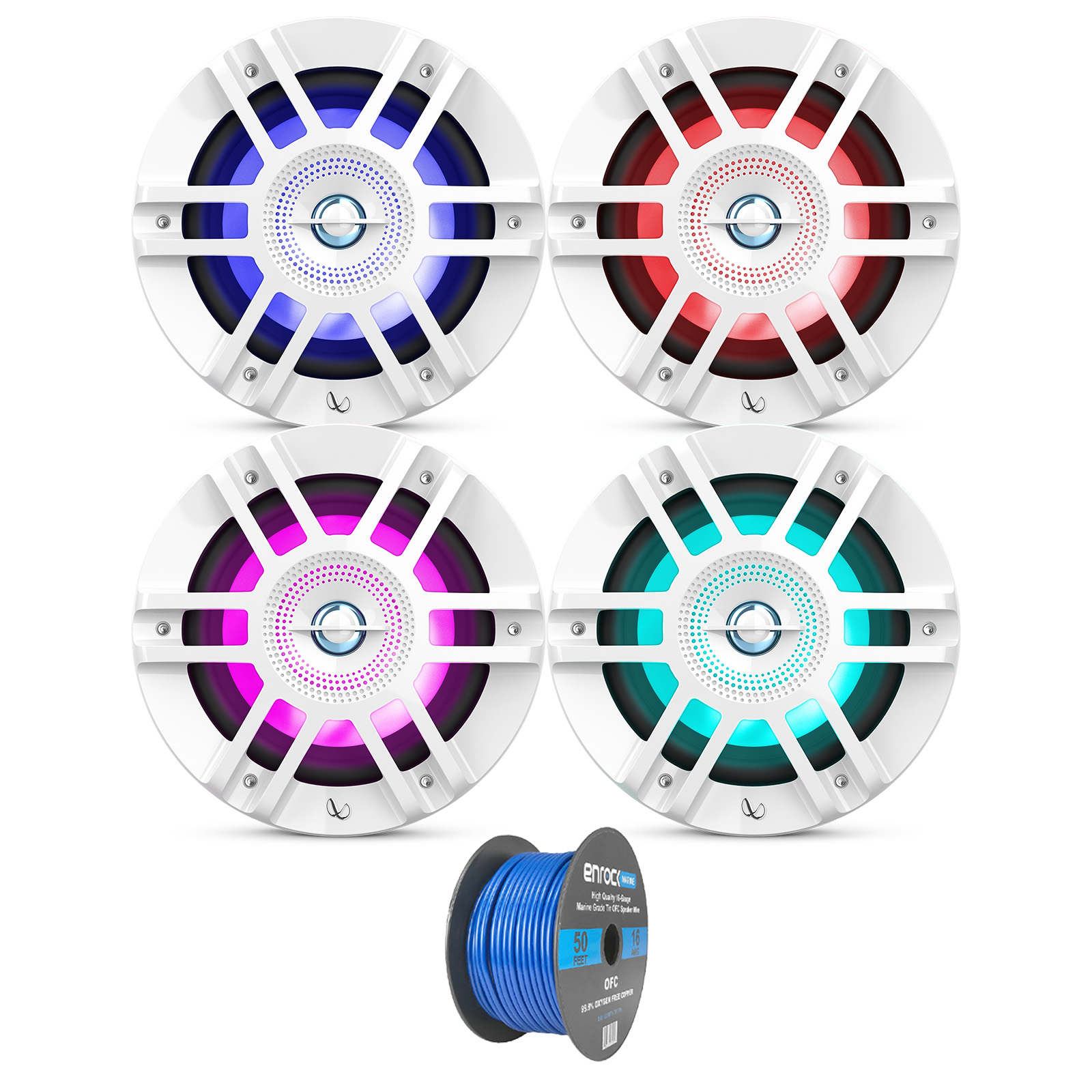 PACKAGE BUNDLE INCLUDES: 4 x Infinity KAPPA 6120M 6.5" Premiun 2-Way Coaxial 300 Watt Peak Power White Marine Speakers with RGB LED Lighting, Enrock Audio EB16G50FT-CCA 16 AWG Gauge 50 Feet Speaker Wire Cable.