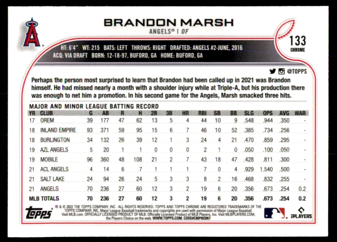 | Description: | Brandon Marsh | | Category: | Baseball | | Year: | 2022 | | Product: | Topps Chrome | | Team: | Salt Lake Bees | | Dimensions: | 3½" x 2½" |