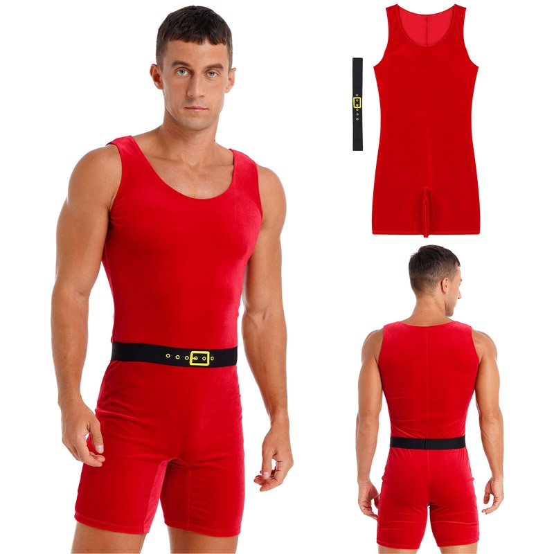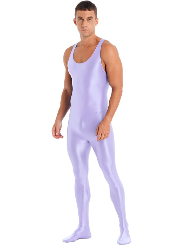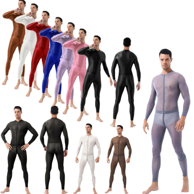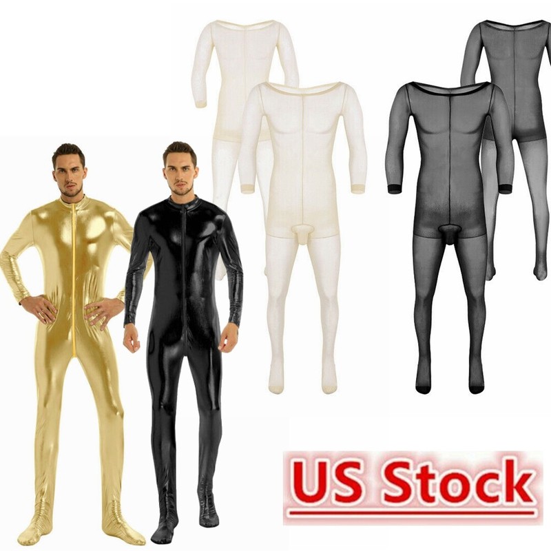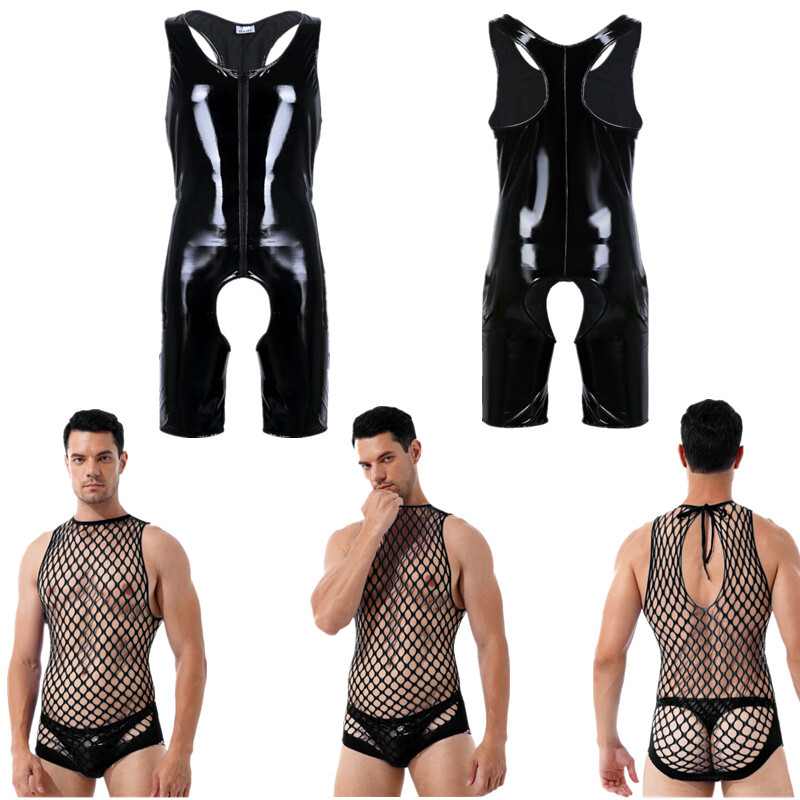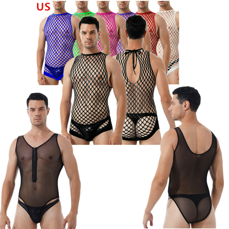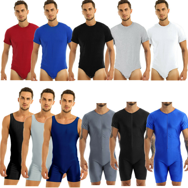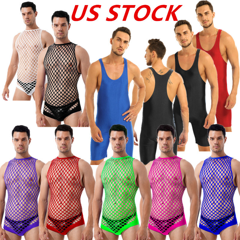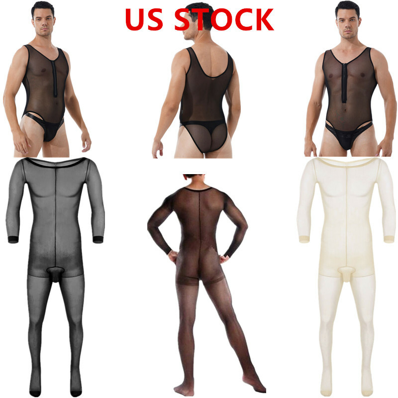 Mens Sleeveless Full Body Bodysuit Solid Color Round Neck Bodystocking Nightwear.