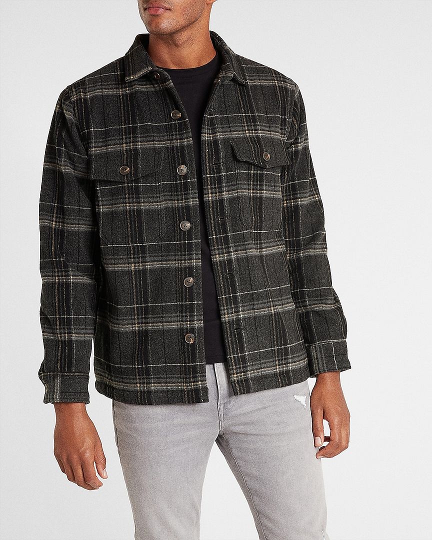Details: Throw this shirt jacket over your favorite tee on chillier days to keep warm and cozy. Featuring a plaid print and sherpa-lined interior- this layer will be your new go-to. Point collar; Button front. Long sleeves with button cuffs. Buttoned patch chest pockets. Straight hem. Style: 01766647