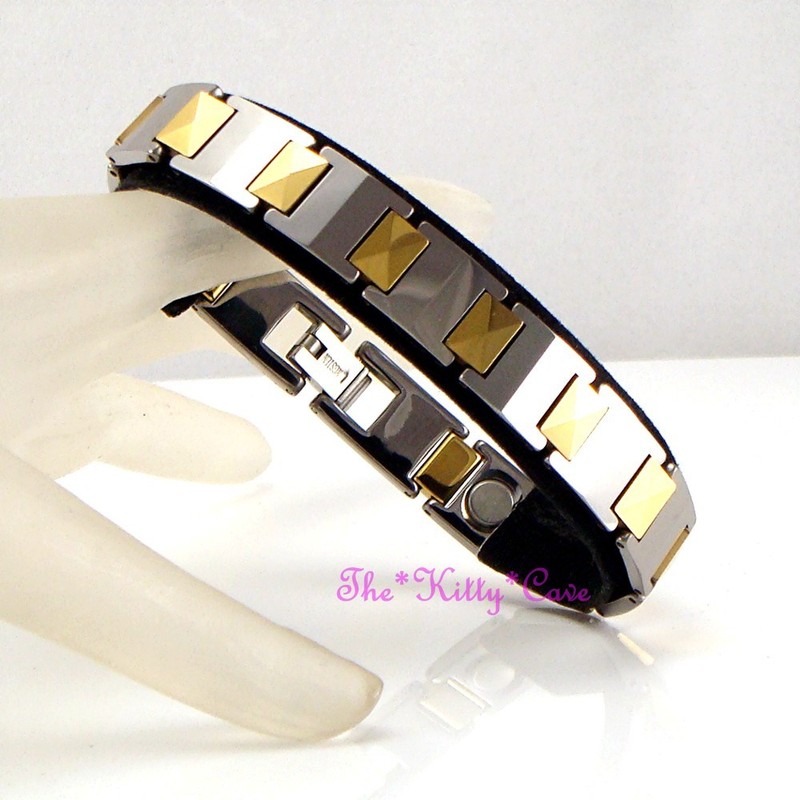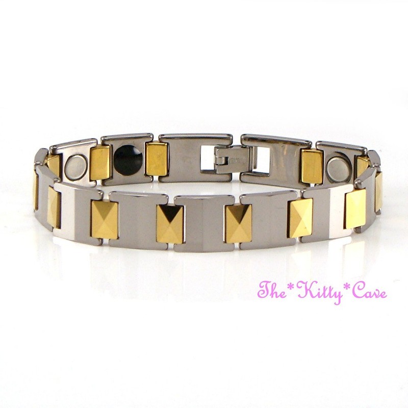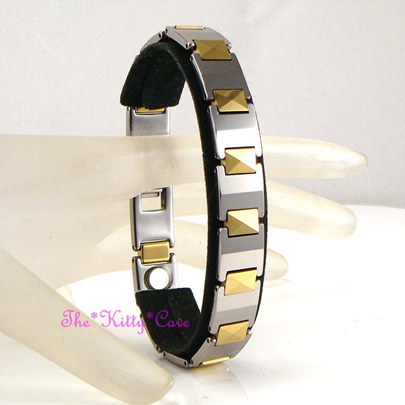 A Premium Quality bracelet, fitted with 12 strong, 3'000 gauss high strength rare earth Neodymium Bio-Magnets which are believed to provide Therapeutic Healing that can fundamentally improve Blood Circulation. It is claimed that the magnetic fields causes the blood to carry away damaged and toxic materials, which are the cause of pain, more effectively. 6 of these are capped and coated in black to provide a design feature on the inside of the bracelet. There are no known side effects for using magnetic products, and there is no time limitation for length of time one can wear.