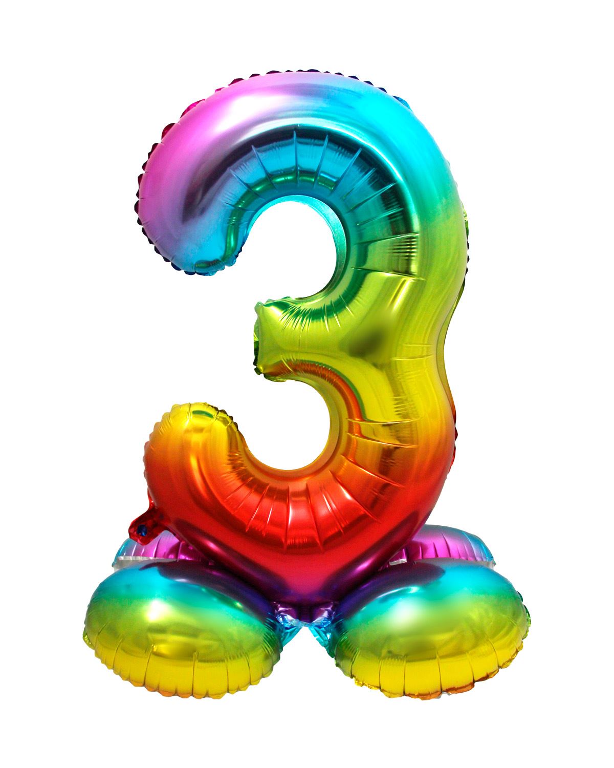 Great fun and really colourful number 3 rainbow foil balloon with standing base. Combine with another number for your required age. This balloon does not need helium as it stands on its own with its base.