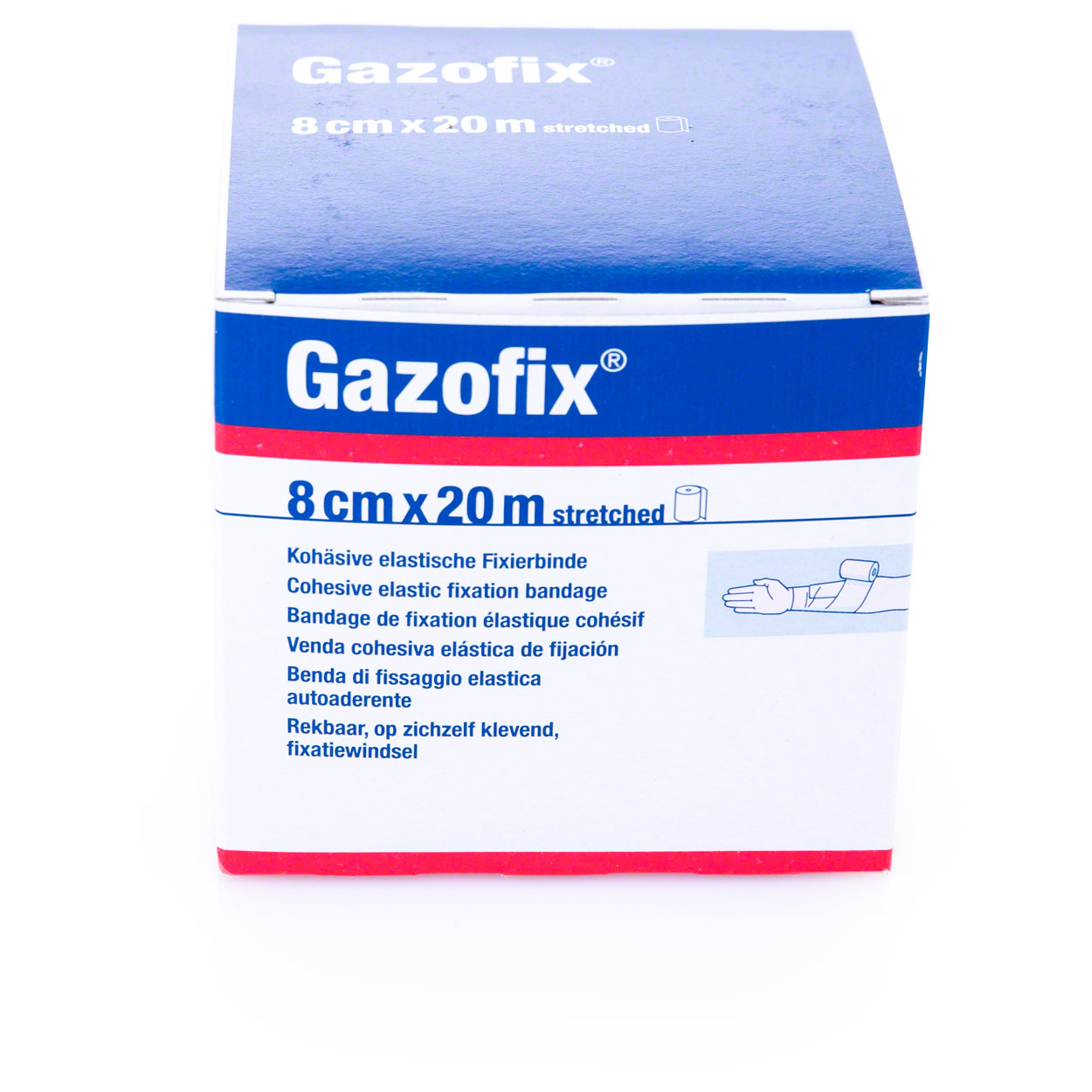 Gazofix ist eine elastische Kohäsivbinde mit mikropunktueller Latexbeschichtung, extradünn gewebt und mit festem Zug, als textile Grundlage unter Tape-Verbänden.