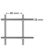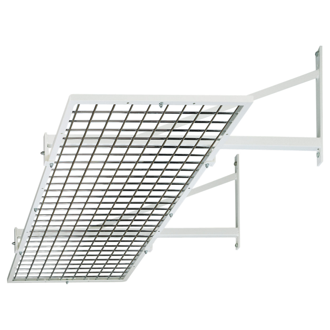 Der Wandschlingentisch Exklusiv aus weiß-kunstoffbeschichtetem Vierkantstahlrohr mit stabilisierender Mittelstrebe. Der Unterschied zwischen Standard und Exklusiv Modell besteht darin, dass beim Exklusiv-Modell eine dritte Wandbefestigung zur Verfügung steht und das Gitter aus 8 mm starkem Rundstahl gefertigt wird. Der Tisch ist somit belastbarer.