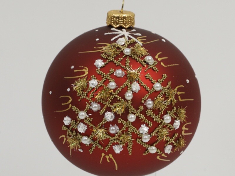 This is a New DAGMARA Glass Ball Ornament in the RED SATIN JEWELED GOLD HOLIDAY TREE pattern.