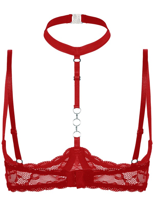 Womens 1/4 Cups Underwire Bra Halter Neck O Ring Sheer Lace Push Up Brassiere Underwear.