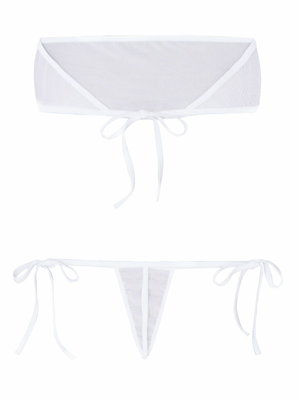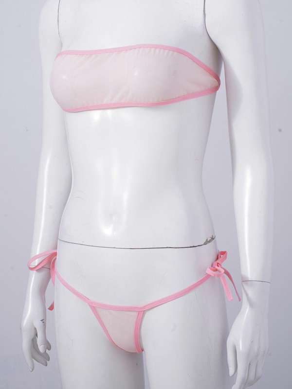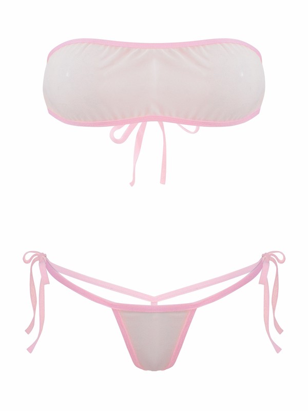Womens See-through Mesh Bikini Set Swimwear Strapless Bra Crop Top with Lace-up Thong.