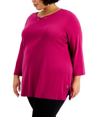 Designed to flatter the plus size figure, Karen Scott's 3/4-sleeve tunic top features subtle stylish details including a split hemline and grommet accents that upgrade your wardrobe with ease. (Clearance)