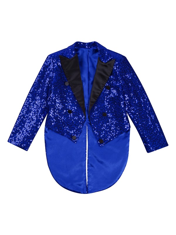 Kids boys full sequin tailcoat satin peaked lapel open front long sleeve blazer for magic shows performance.