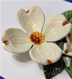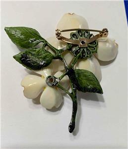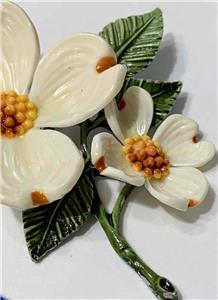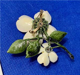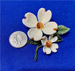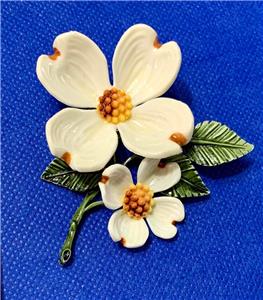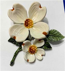 Very pretty Dogwood two flower acrylic pin brooch. The petals are white with amber tips and amber and yellow centers. Green leaves complete the piece. The brooch measures about 2-3/4" tall by 2-3/8" wide. Please examine the attached photos, they describe this listing better than any words.
