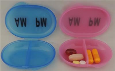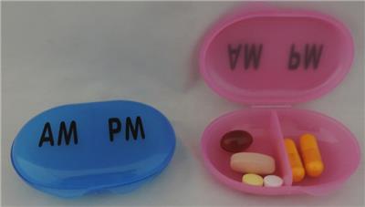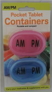 Easily carry your medication and supplements with you with this 4-piece AM/PM Pocket Tablet Containers Set featuring portable, compact, 2-section divided snap shut containers made of durable plastic. Containers measure approximately 2.75" x 0.75" x 2". Comes packaged in a blister pack with one Blue and one Pink AM/PM Pocket Tablet Container. You will receive 2 packs of 2 for a total of 4 containers.
