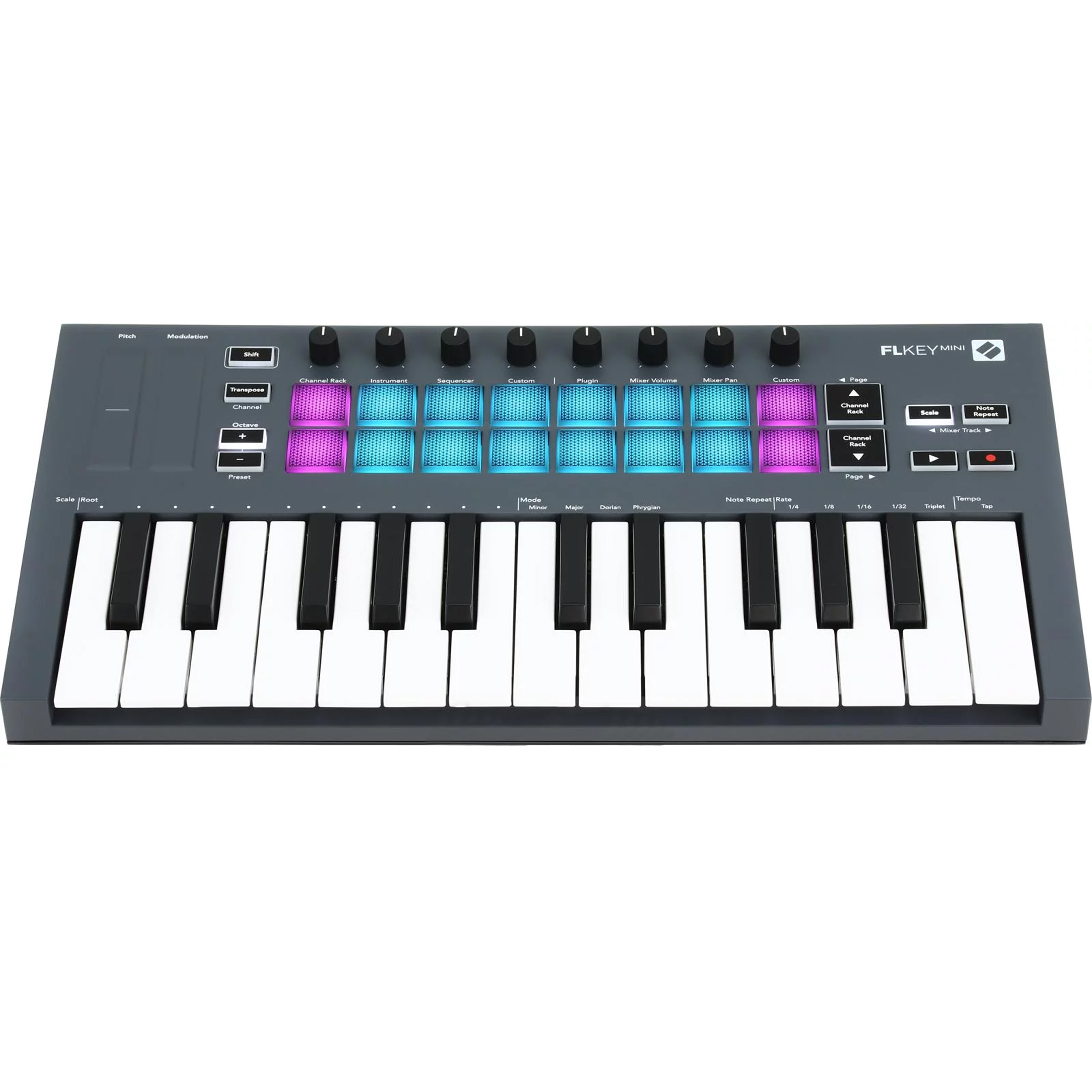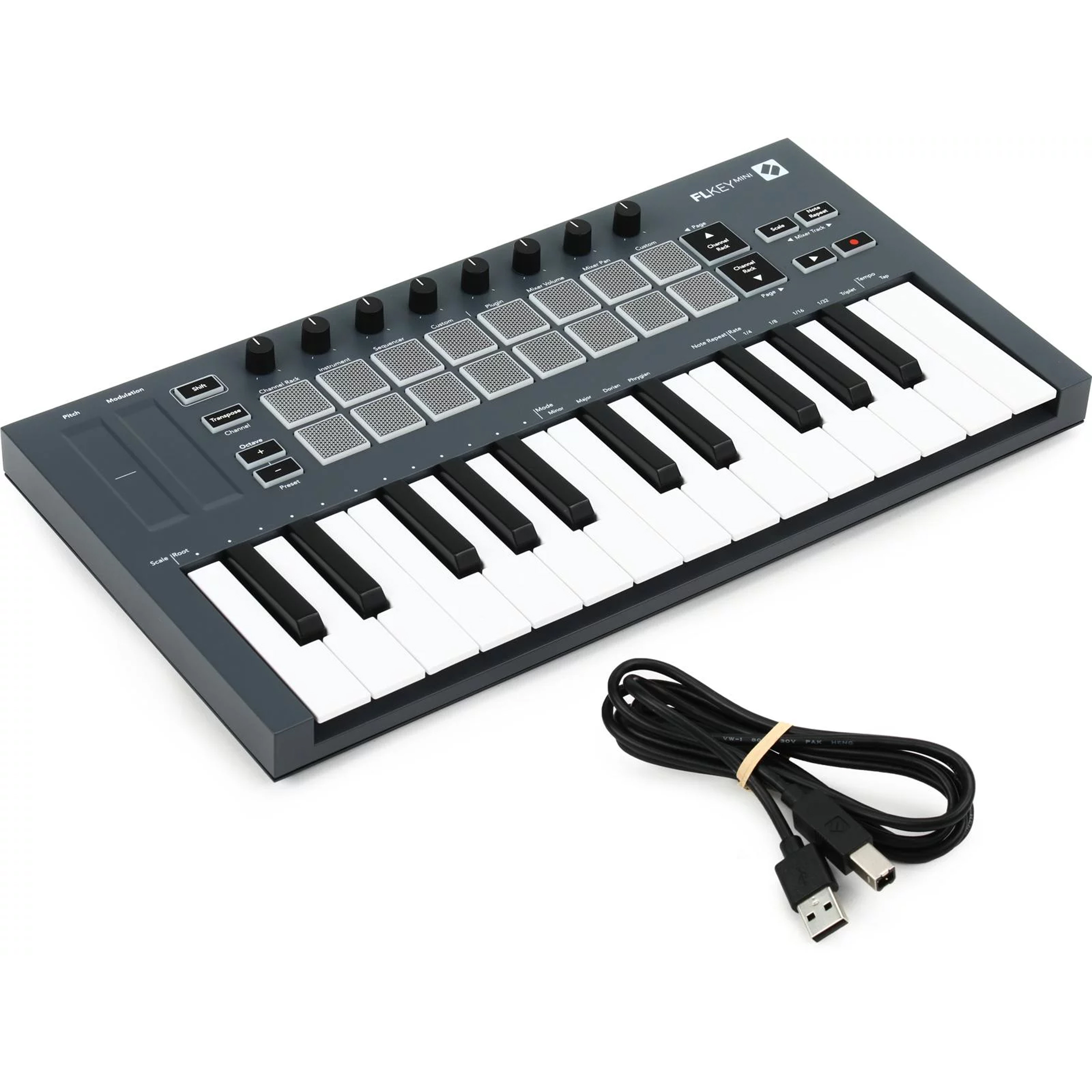 FLkey Mini is the ultimate compact 25-mini-key MIDI keyboard for making music in FL? Studio. Combining hands-on control of the most important FL Studio features with our best mini keys to date, FLkey Mini puts production in your hands and connects you with your music. Sequencer Mode maps FLkey Mini's pads to FL Studio's step sequencer for sketching beats fast. Two Pad modes give your rhythms real human feel and get you off the grid: play straight into the Channel Rack or FPC, and trigger slices in SliceX. Need some crisp hi-hat rolls? Note Repeat makes it easy every single time. Bring FL Studio's Mixer off the screen and into your hands - use the eight knobs to tweak your mix and record automation on the fly. Browse presets in your Image Line plug-ins to change up instruments and sounds fast, with no mouse needed. Scale mode makes sure you always hit the right note, keeping the music flowing. Fixed Chord mode lets you play a custom chord with one finger. Combine musical tools to immediately unlock new creative boundaries and find ideas you never knew you had. FLkey Mini comes with a six-month trial of FL Studio Producer. Make more of your music, however you want, wherever you want.