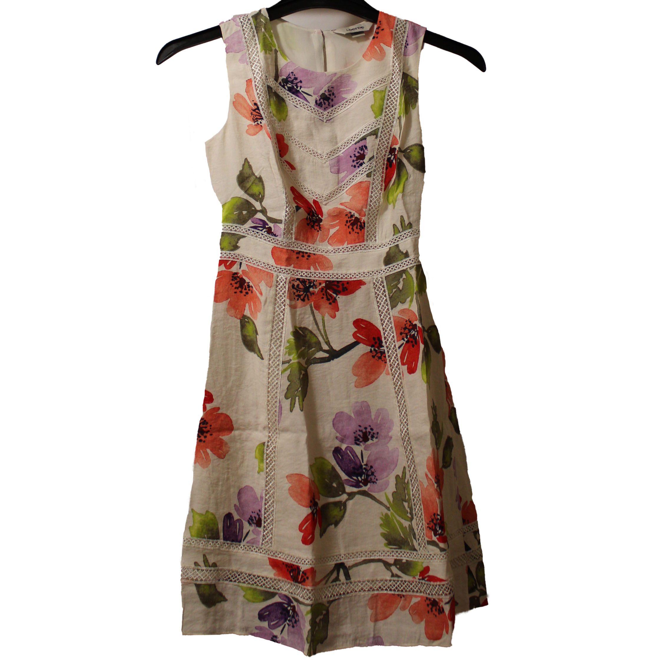Lands' End Women's Size 0 Petite Sleeveless Lace Trim Dress, Off-White Floral Shell: 70% Rayon 30% Nylon Lining: 95% Polyester 5% Spandex Machine Wash