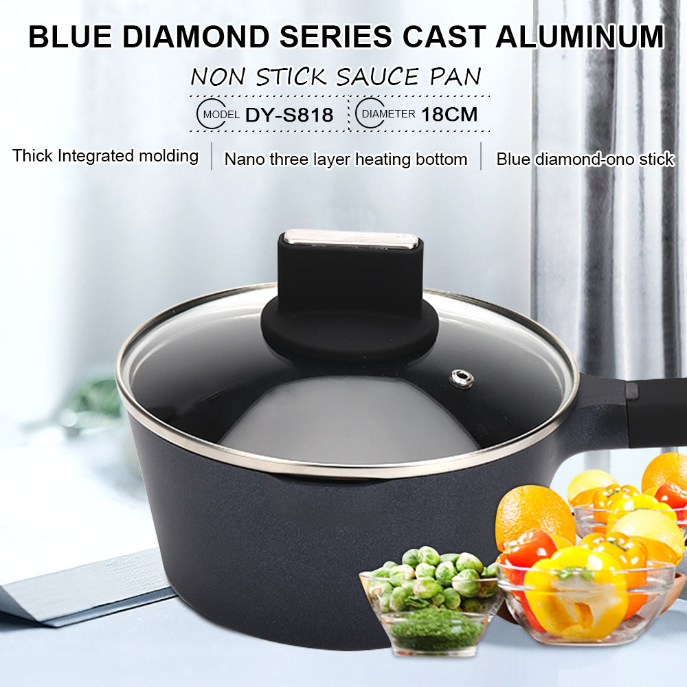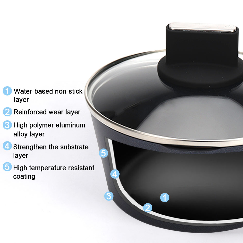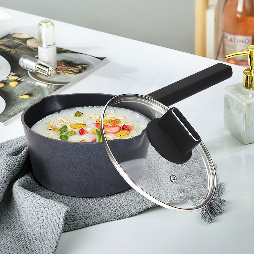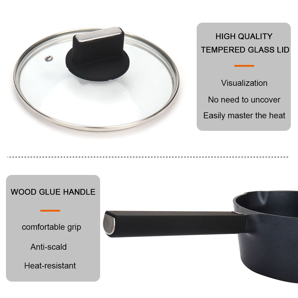 【Ergonomic Handle & Tempered Glass Lid】The sauce pot has ergonomic woodgrain bakelite handle ,you can grip it comfortably. Good heat resistance let the handle stay cool while cooking.The cooking pan with high temperature resistant tempered glass lid could directly observe the food,making it easy to control the cooking process.