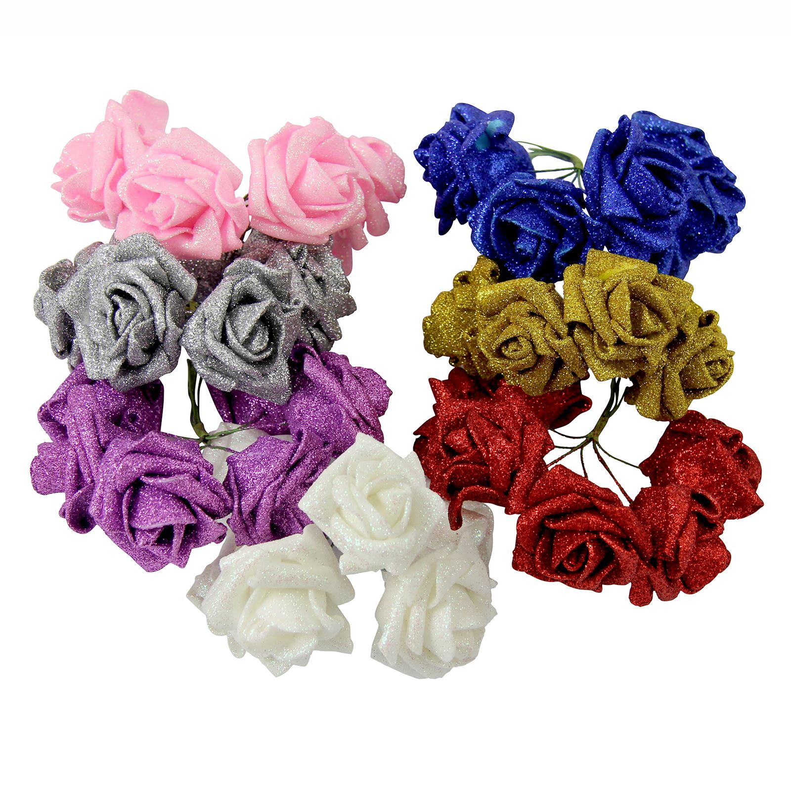 Beautiful little flower bunches lashed in glitter.. Consists of 6 single wired stems which can be separated.. Ideal for bouquet embellishment and decorations.. Head Width: 5cm, Length: 12cm