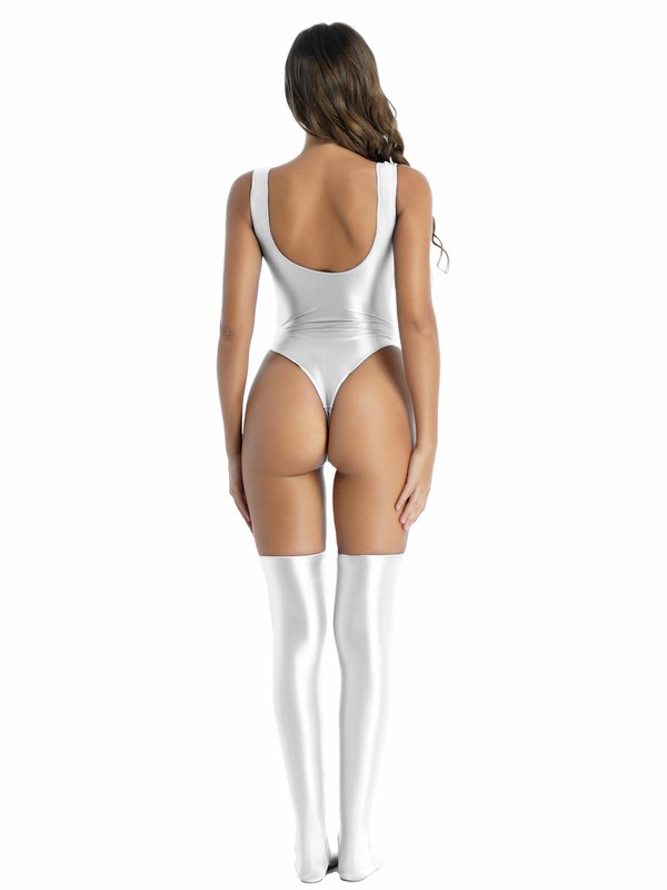 Glossy stretchy swimsuit include round neck sleeveless high cut bodysuit and stocking.