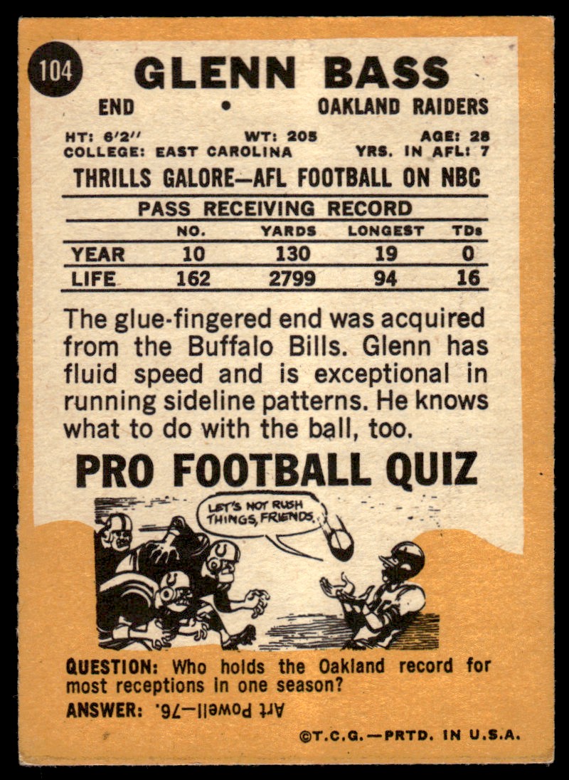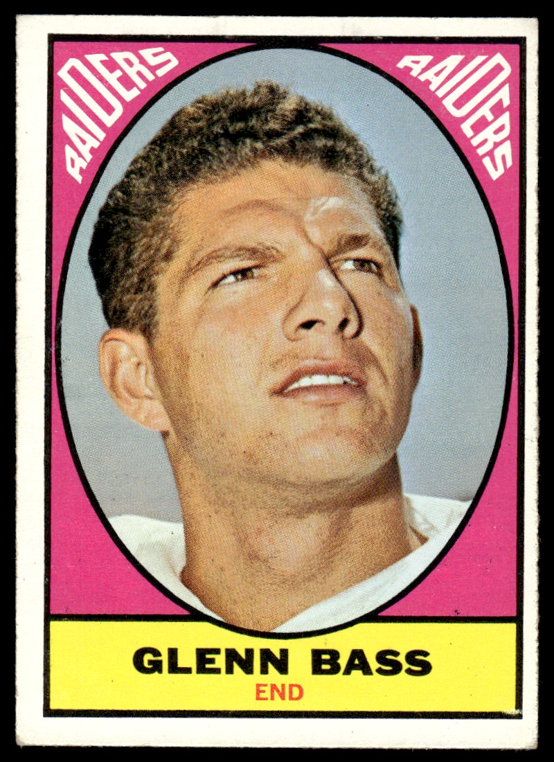| Description: | Glenn Bass D | | Category: | Football | | Year: | 1967 | | Product: | Topps | | Team: | Oakland Raiders | | Card Number: | 104 | | Dimensions: | 3½" x 2½" |