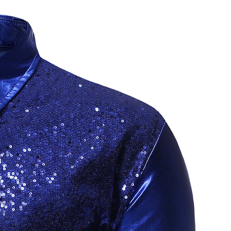 Mens Sparkly Long Sleeves Lapel Sequins Adorned Buttons Closure Shirt.