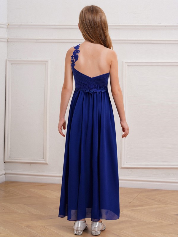 Adorned with guipure lace on shoulder and waist, echoing the airy chiffon skirt that drapes gracefully.