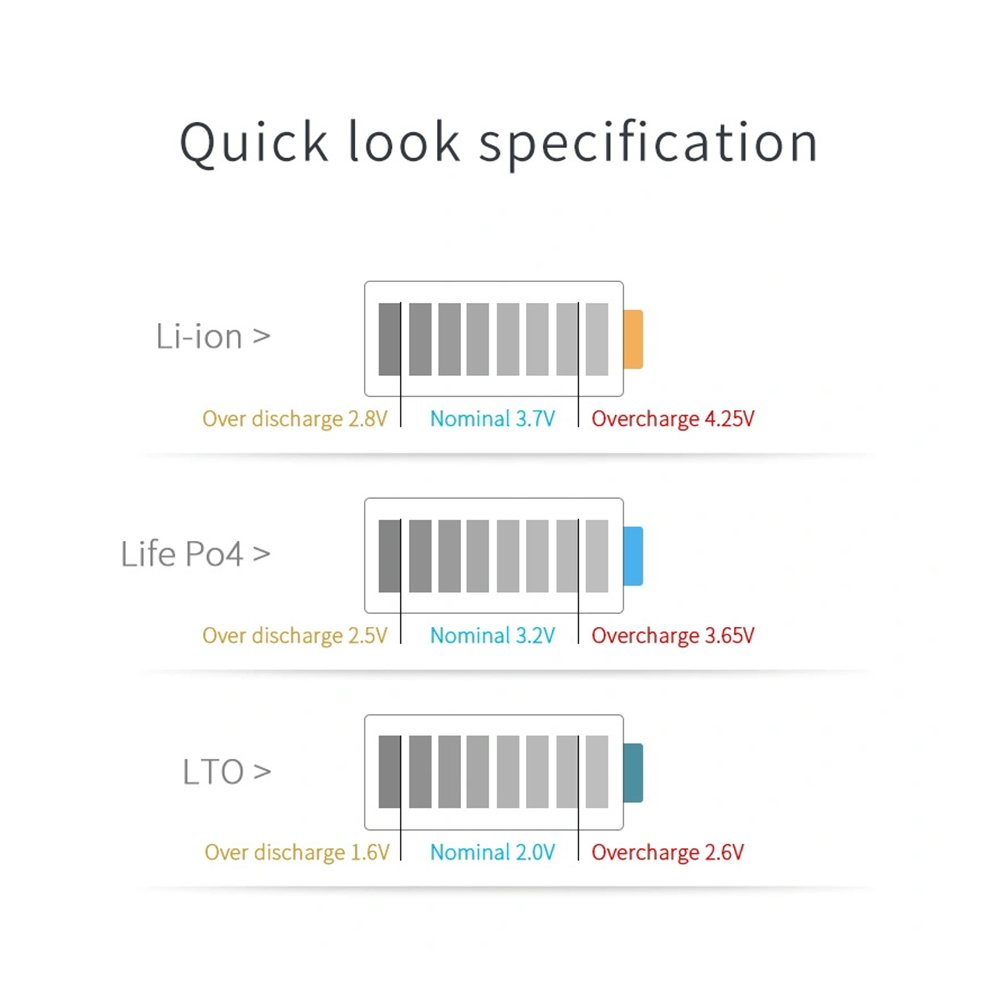 For: LiFePo4 3.2V, Li-ion 3.7V, LTO 2V