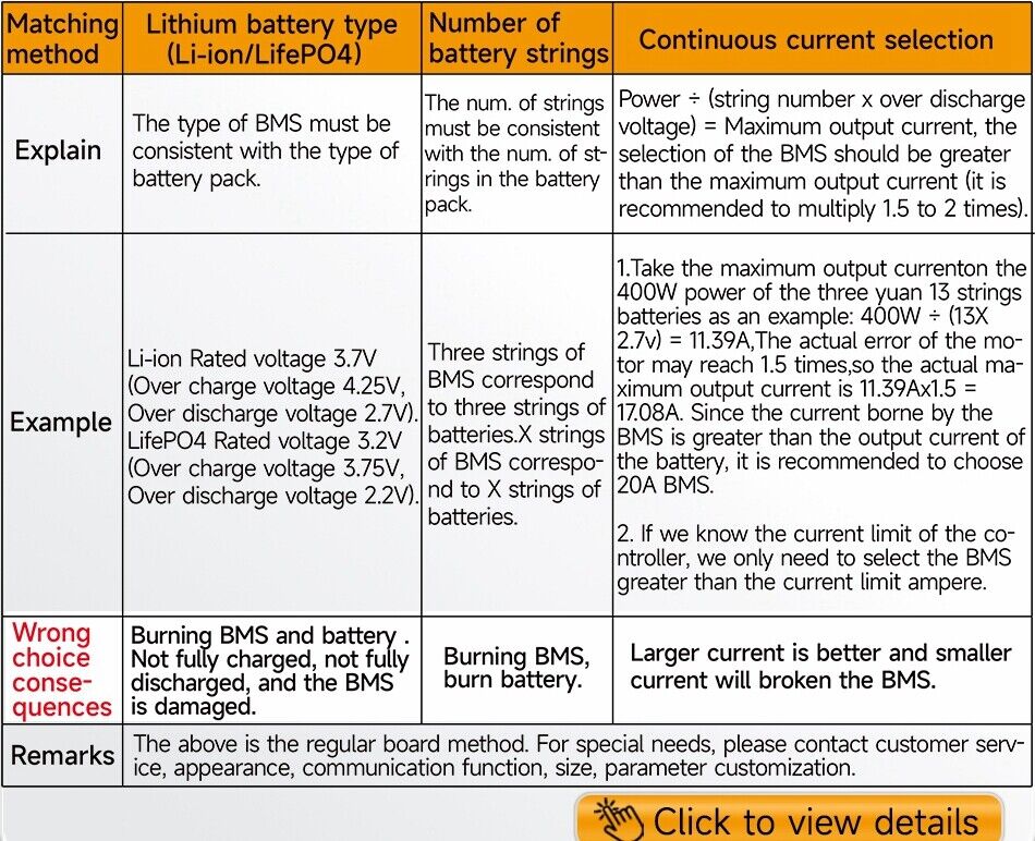 What current BMS you choose is depend on your E-bicycle motor power and current limitation of controller,eg.16A for 350W and below, 25A for 500W and below, 35A for 800W and below, 60A for 1000W and below, over 1200W are contact with our service specialist for suggestion, continue current shall be higher than current limitation in controller.