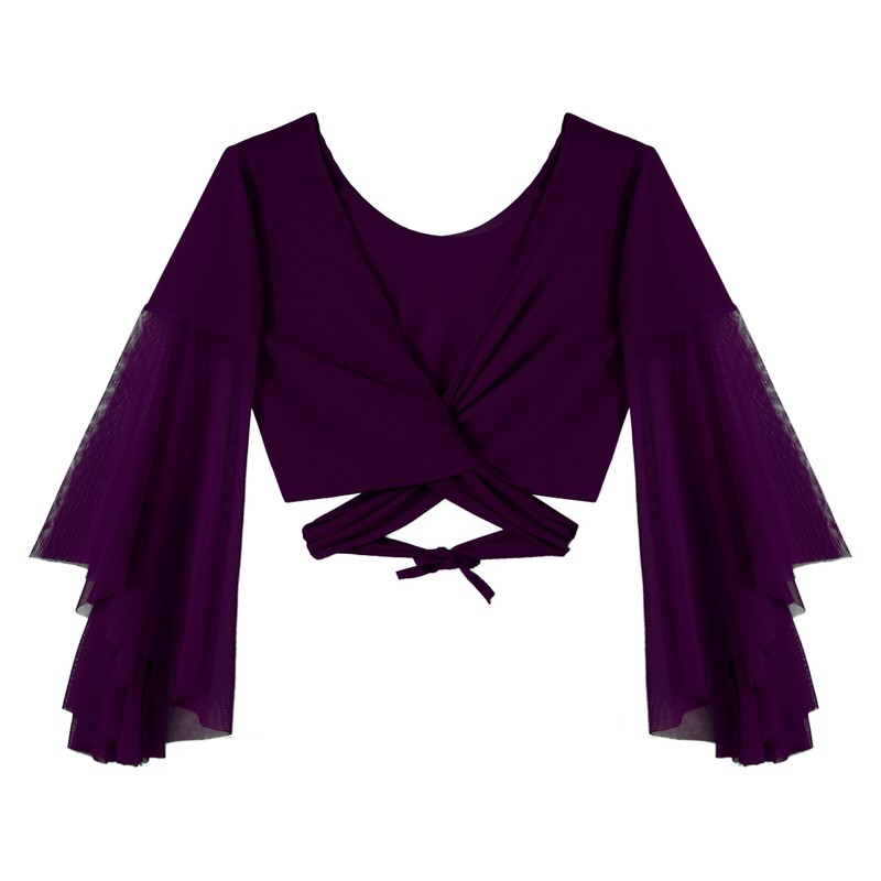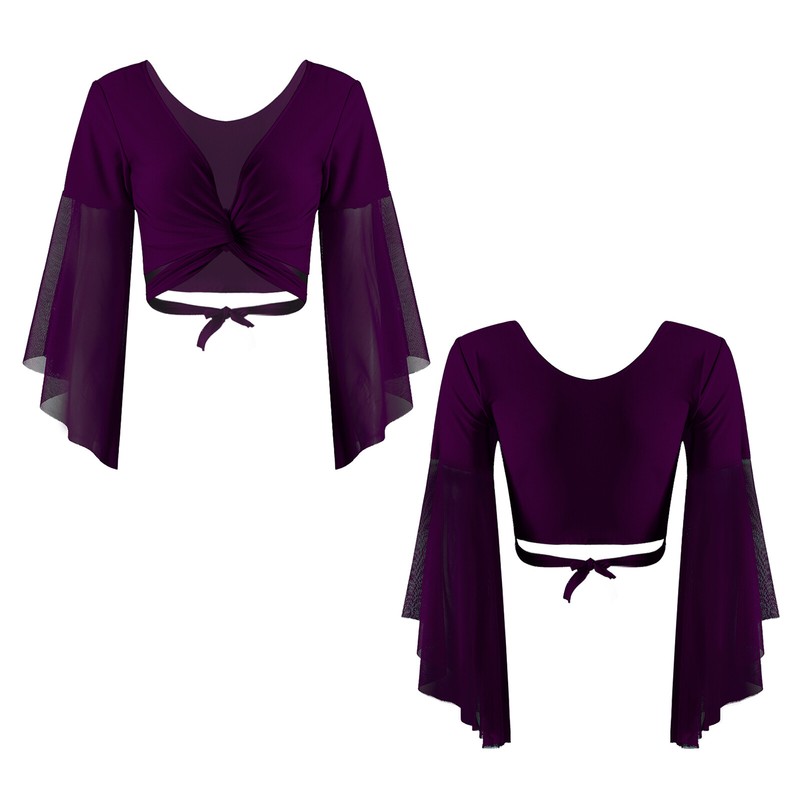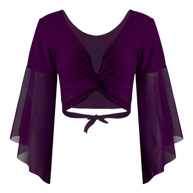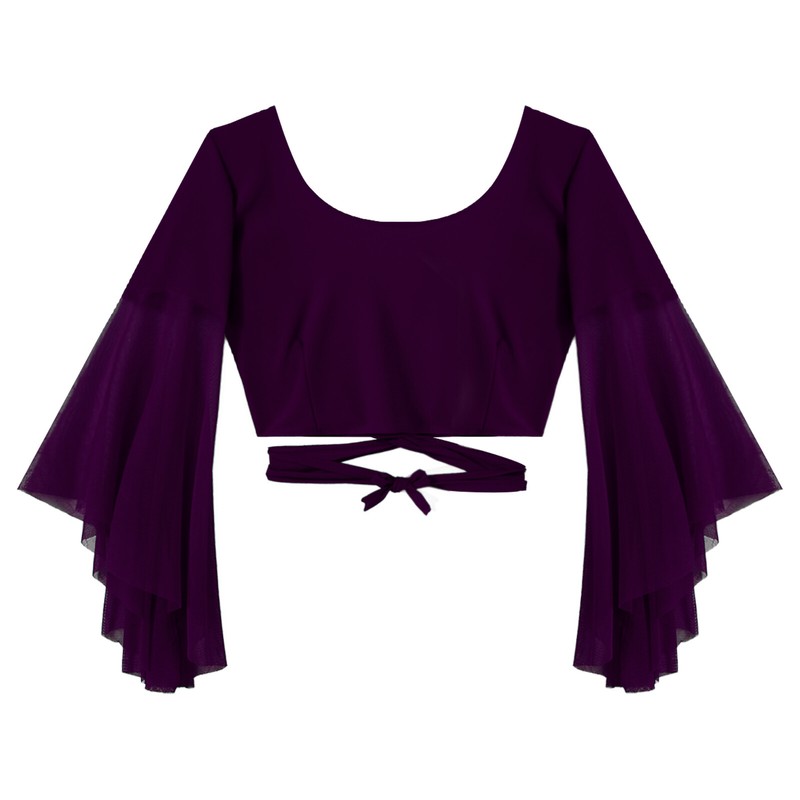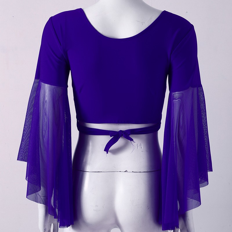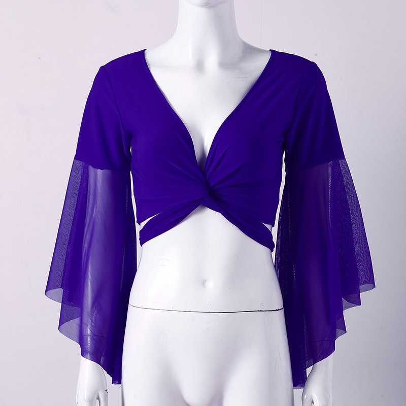 Womens V Neck Lace-up Belly Dance Tops 3/4 Tulle Flared Sleeve Crop Top.