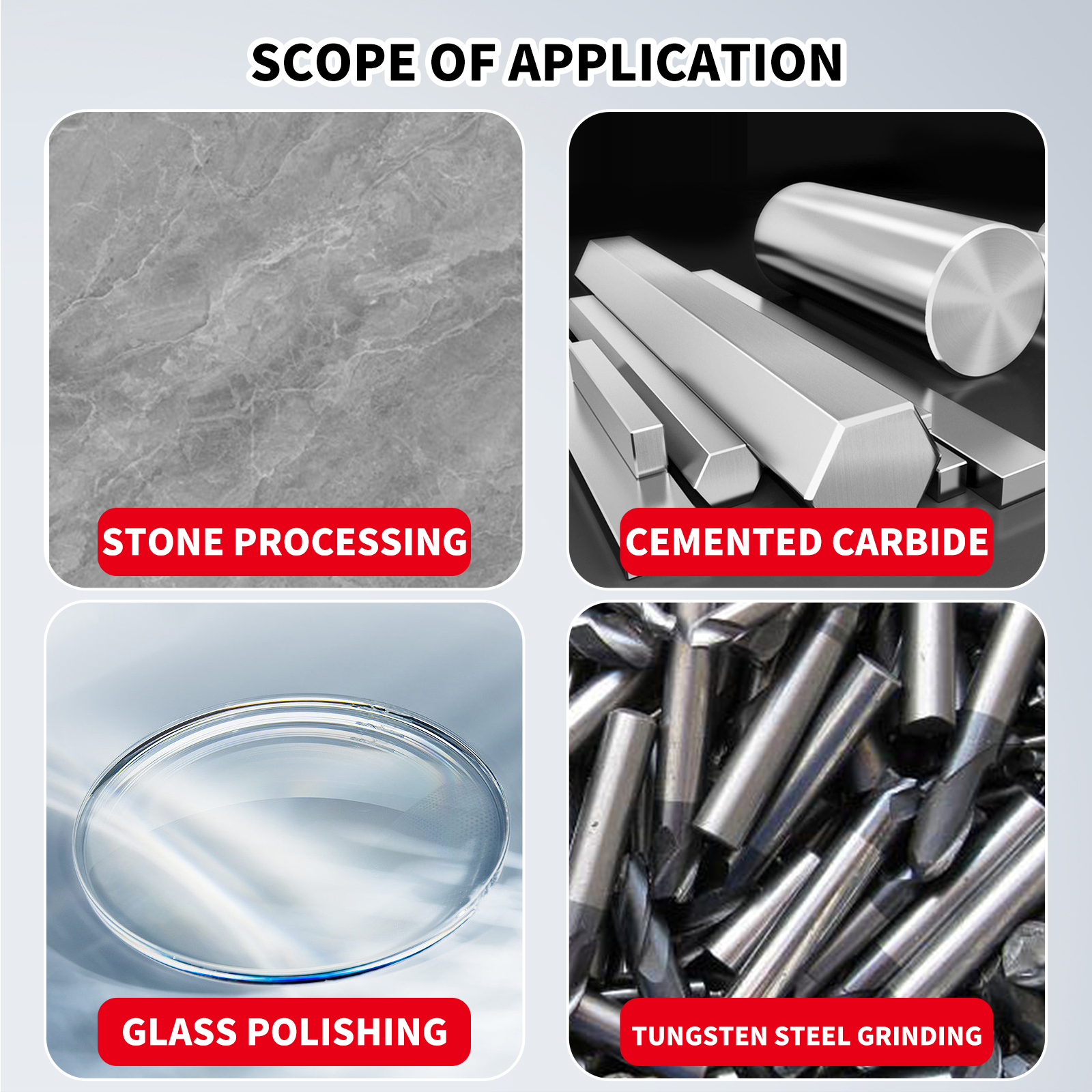 Scope of application: Electroplated flat diamond grinding wheels can process various high-hardness materials, including superhard materials such as tungsten steel; superhard alloy materials