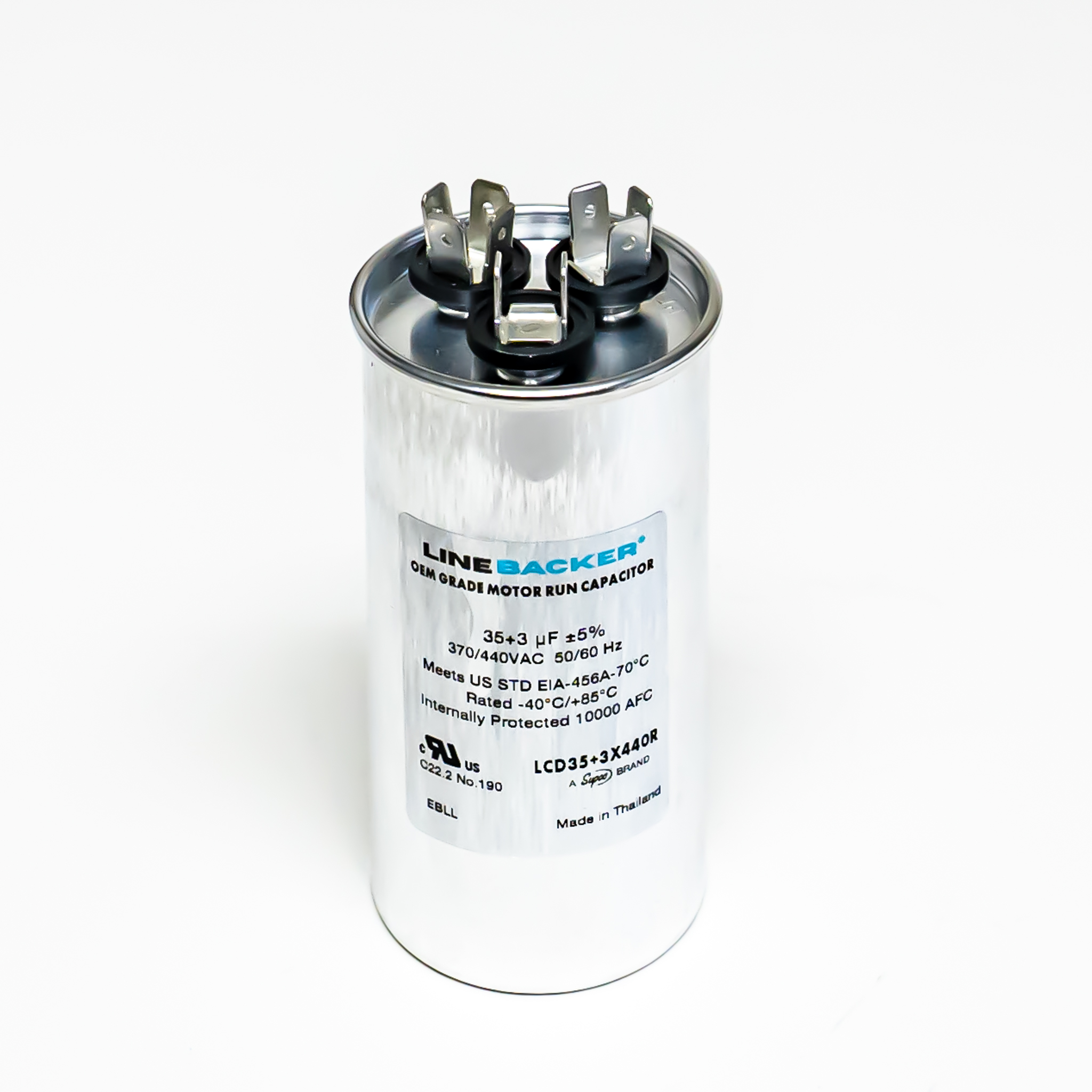 Linebacker Motor Run Capacitors are built for longevity and performance. Engineered by an ISO certified manufacture with over twenty years experience in OEM capacitor fabrication. Linebacker capacitors come off the same production line as the OEM, and are 100% in-line production tested to the same rigorous international standards. Linebacker capacitors are manufactured with thick polypropylene foil to handle increased operating temperatures.