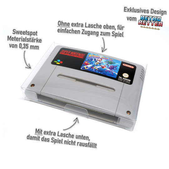 Schutzhüllen mit oder ohne extra Laschen? - Natürlich beides auf einmal!An der einen Seite unserer Schutzhüllen ist eine extra Lasche angebracht, die ungewolltes Öffnen und Herausfallen deiner SNES Games verhindert. Auf der anderen Seite verzichten wir bewusst auf eine zusätzliche Lasche, damit du einfach an deine Games herankommst. Du bekommst bei uns diese beiden Features in einer Schutzhülle.