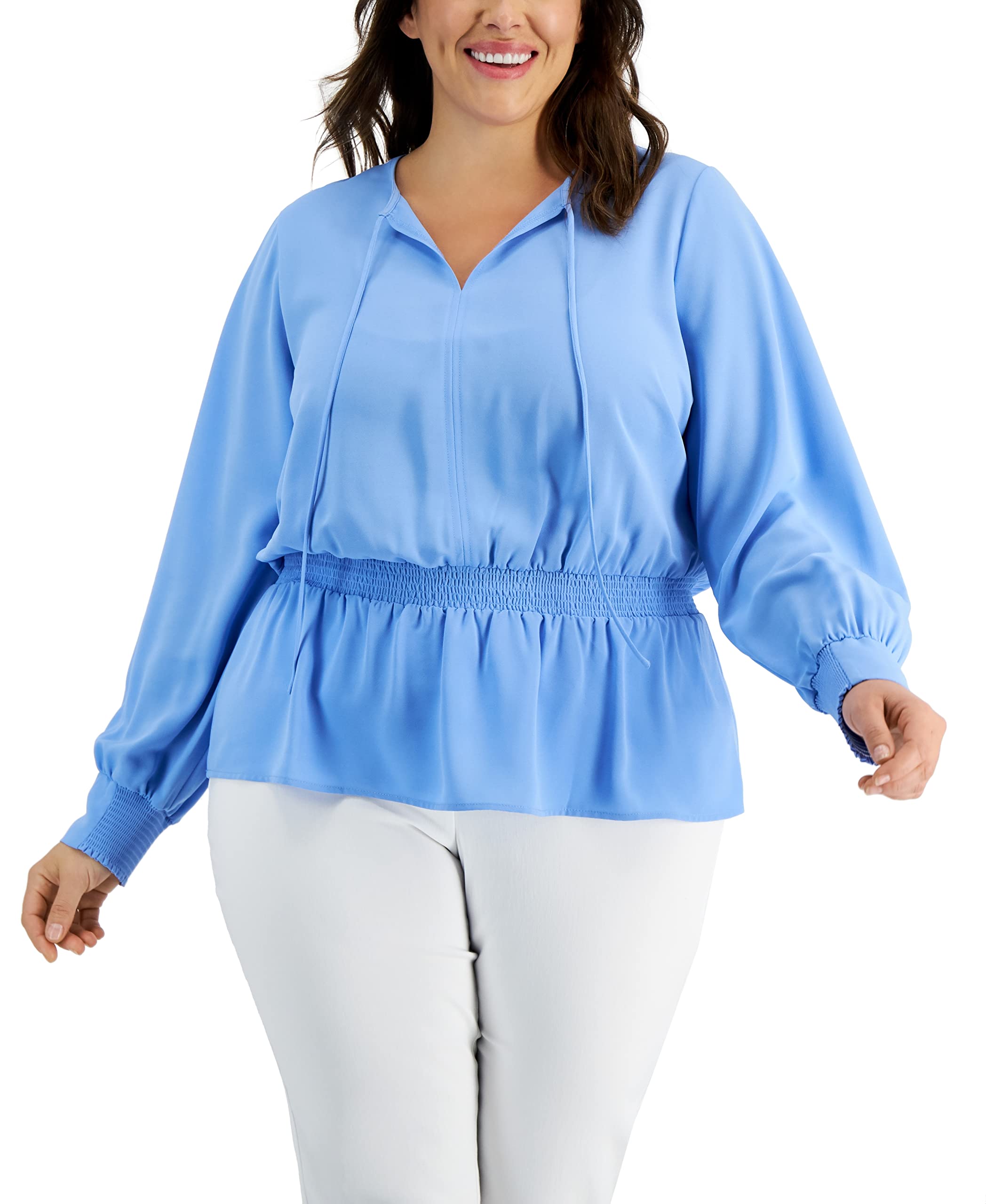 A smocked waistline leads to a flowy peplum hem on this plus size top from Alfani, complete with ties that fall from the neckline.