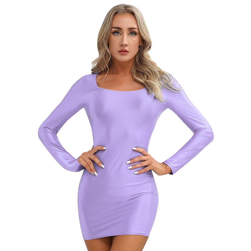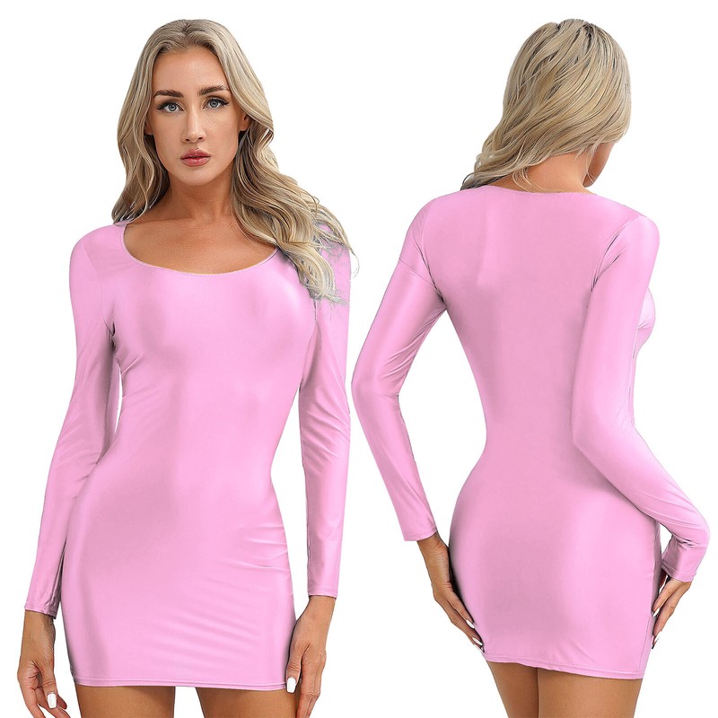 Long sleeve, round neckline dress is above-knee length. Glossy appearance.