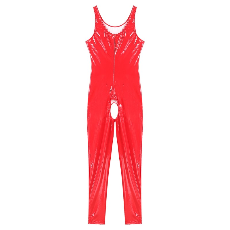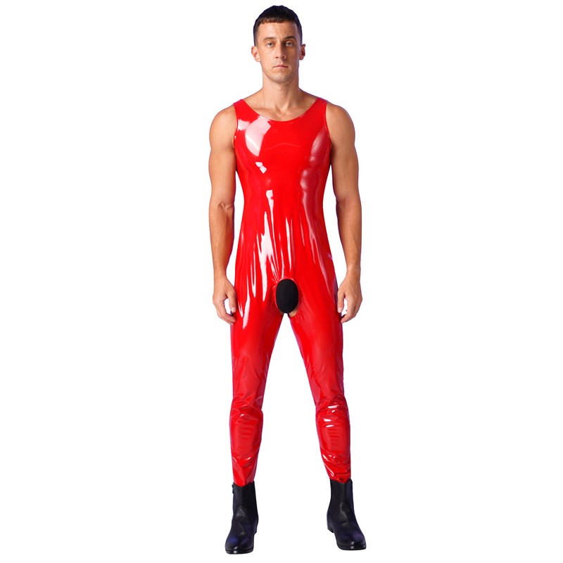 Men’s one-piece leotard jumpsuit catsuit clubwear, wet look appearance, slim fit.