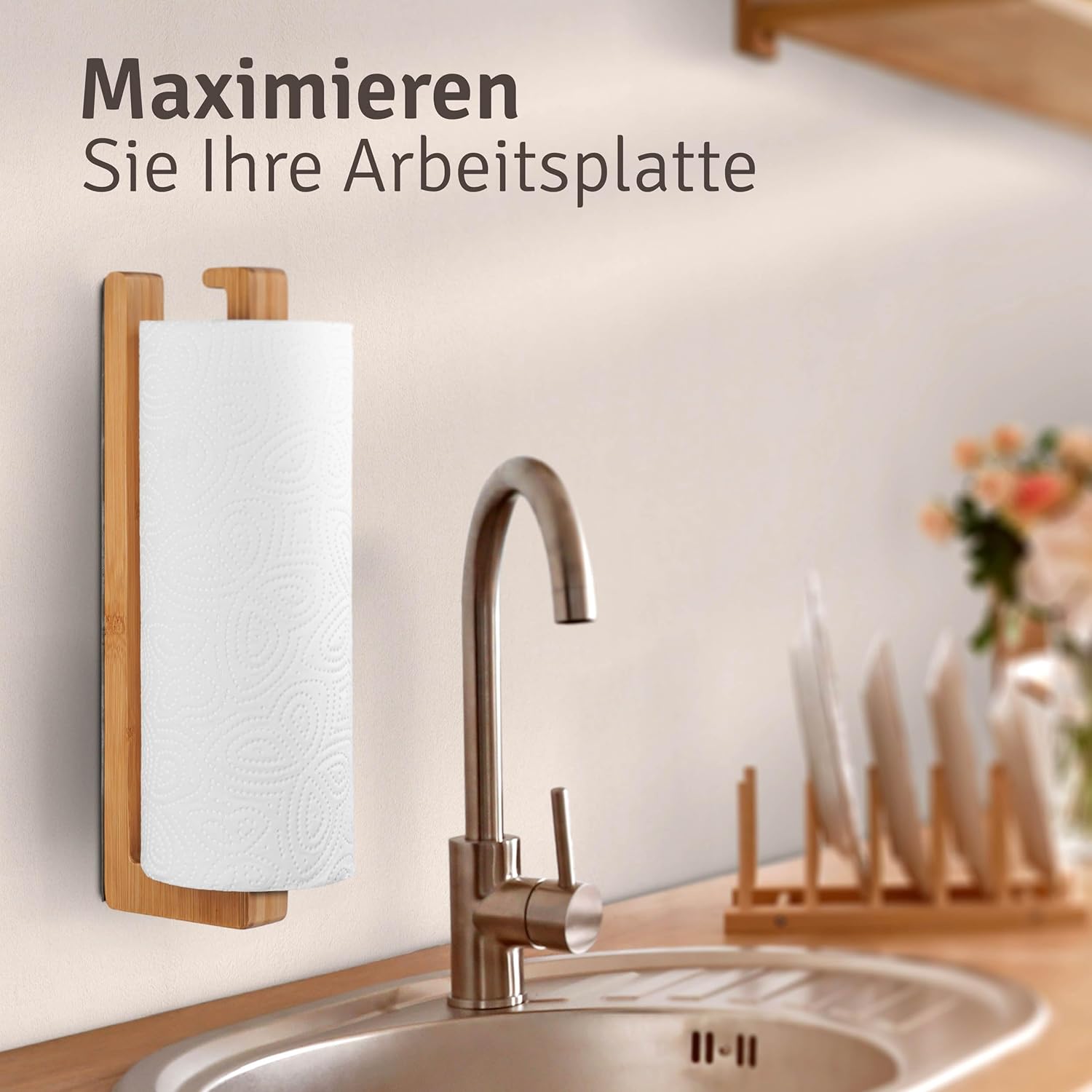 Mit diesem stilvollen Halter aus nachhaltigen FSC Bambusholz kannst Du dein Küchenpapier platzsparend in Deiner Küche aufbewahren.