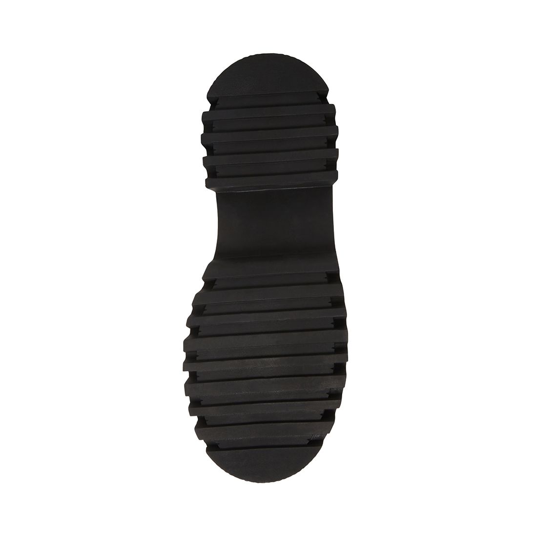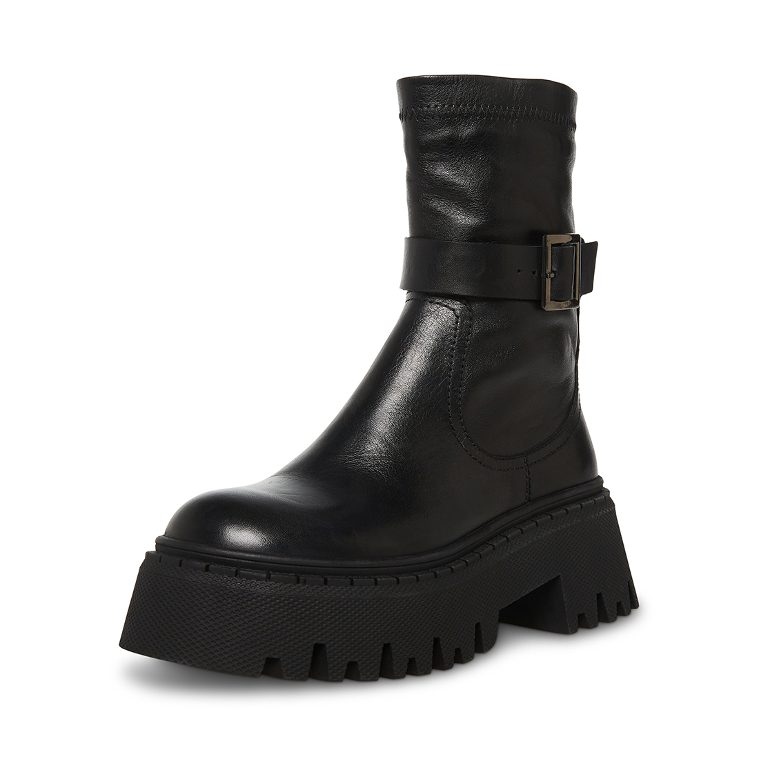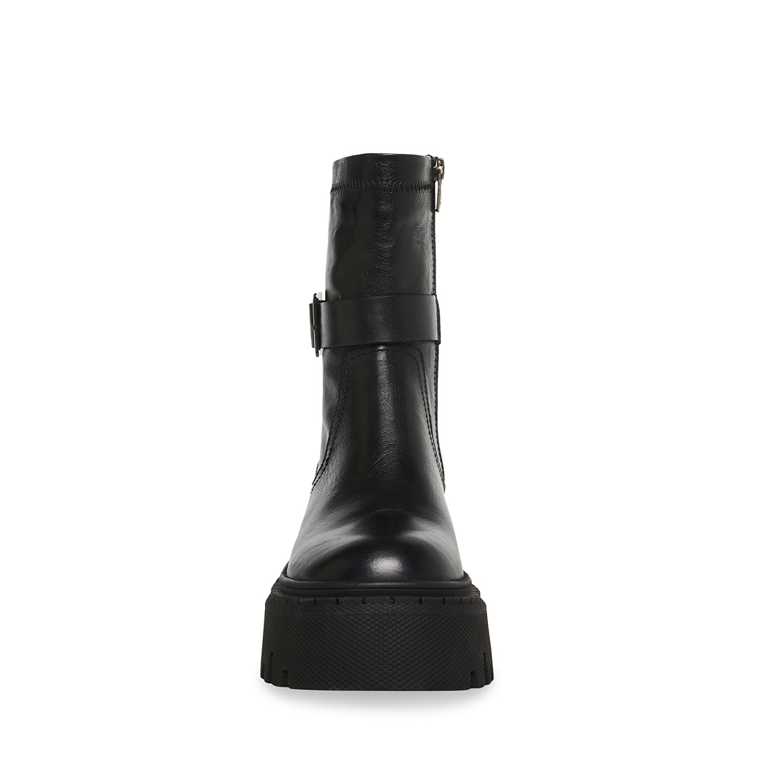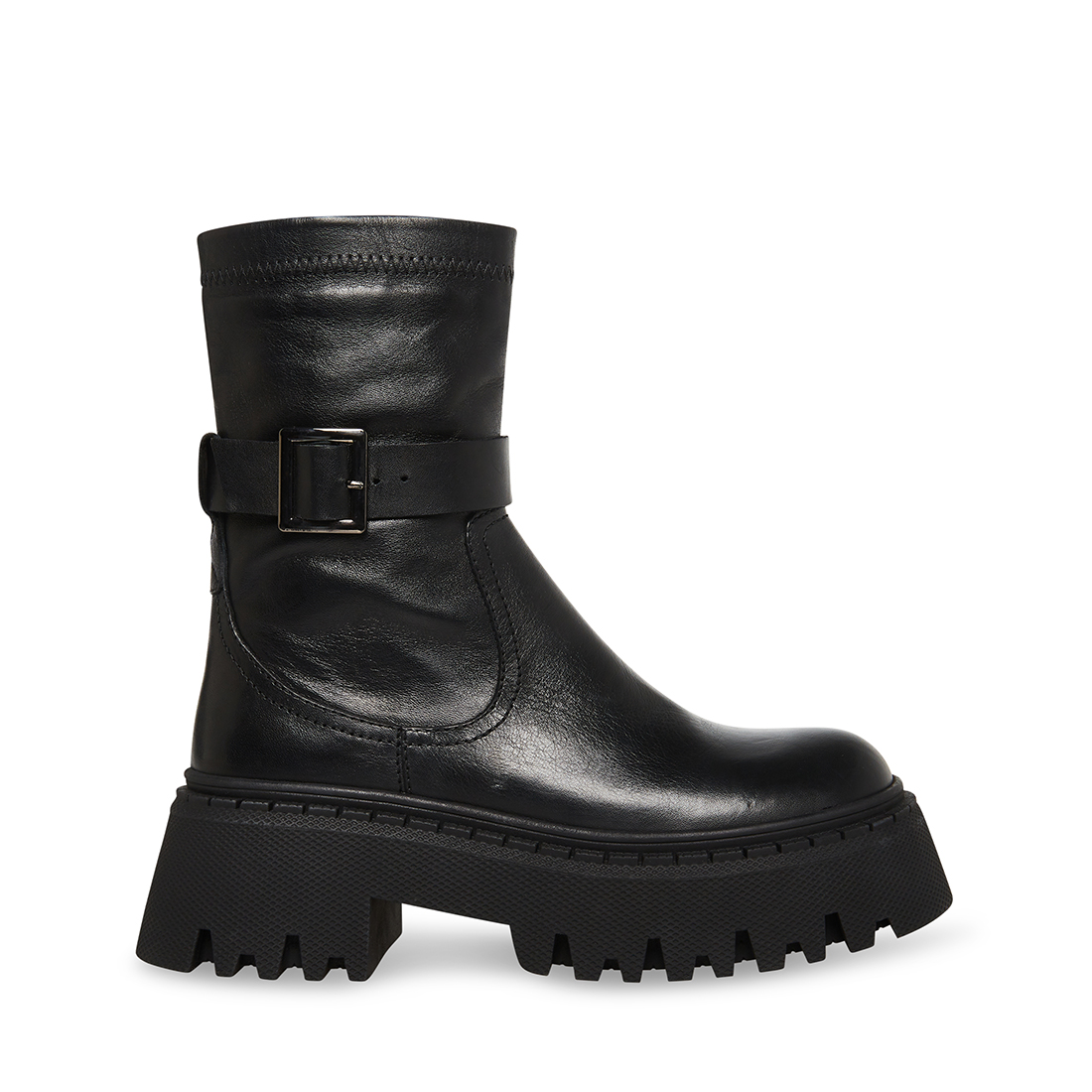 The EVERLY boot sets a luxurious leather mid calf design on a wide treadedplatformsole.