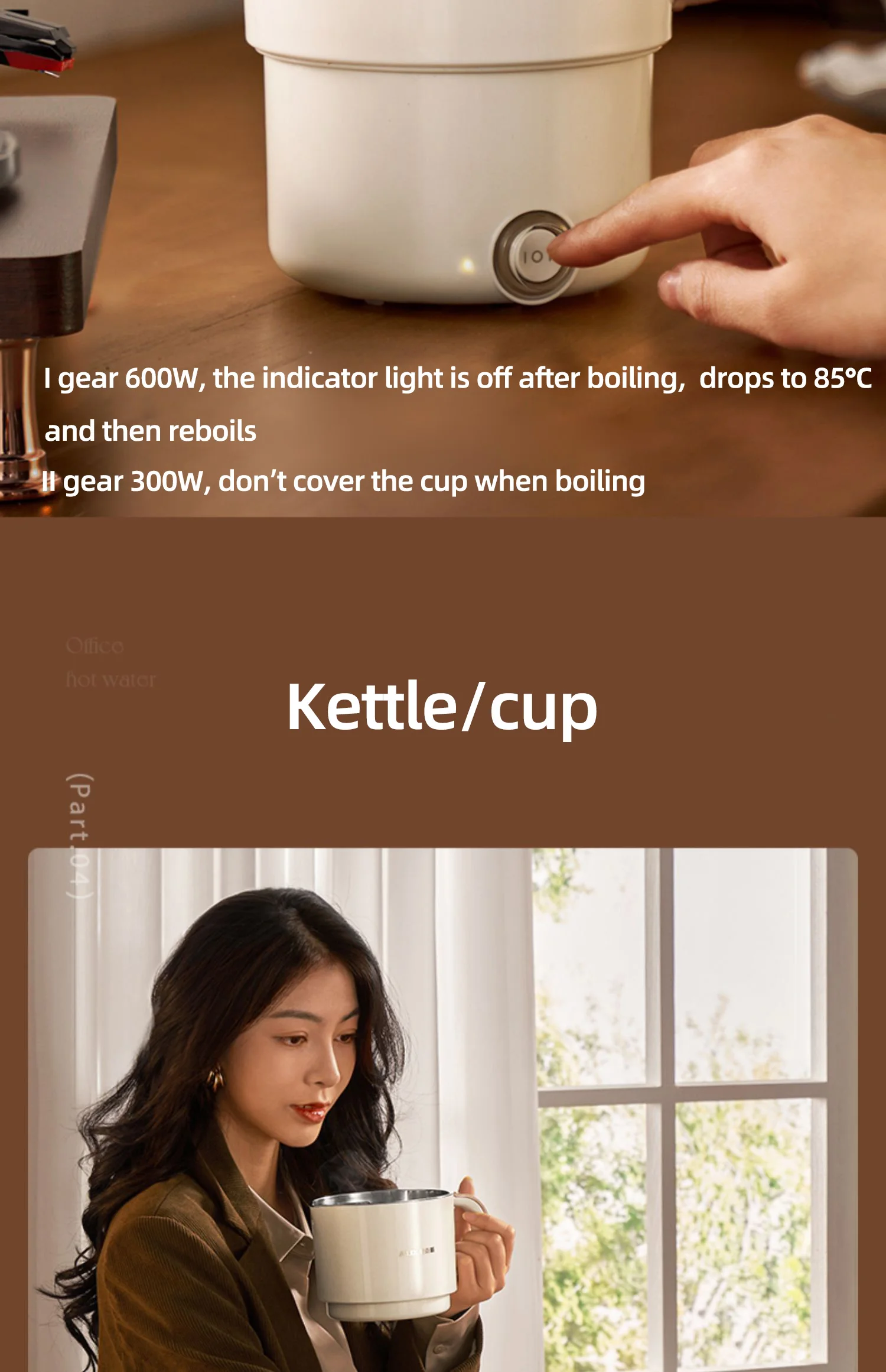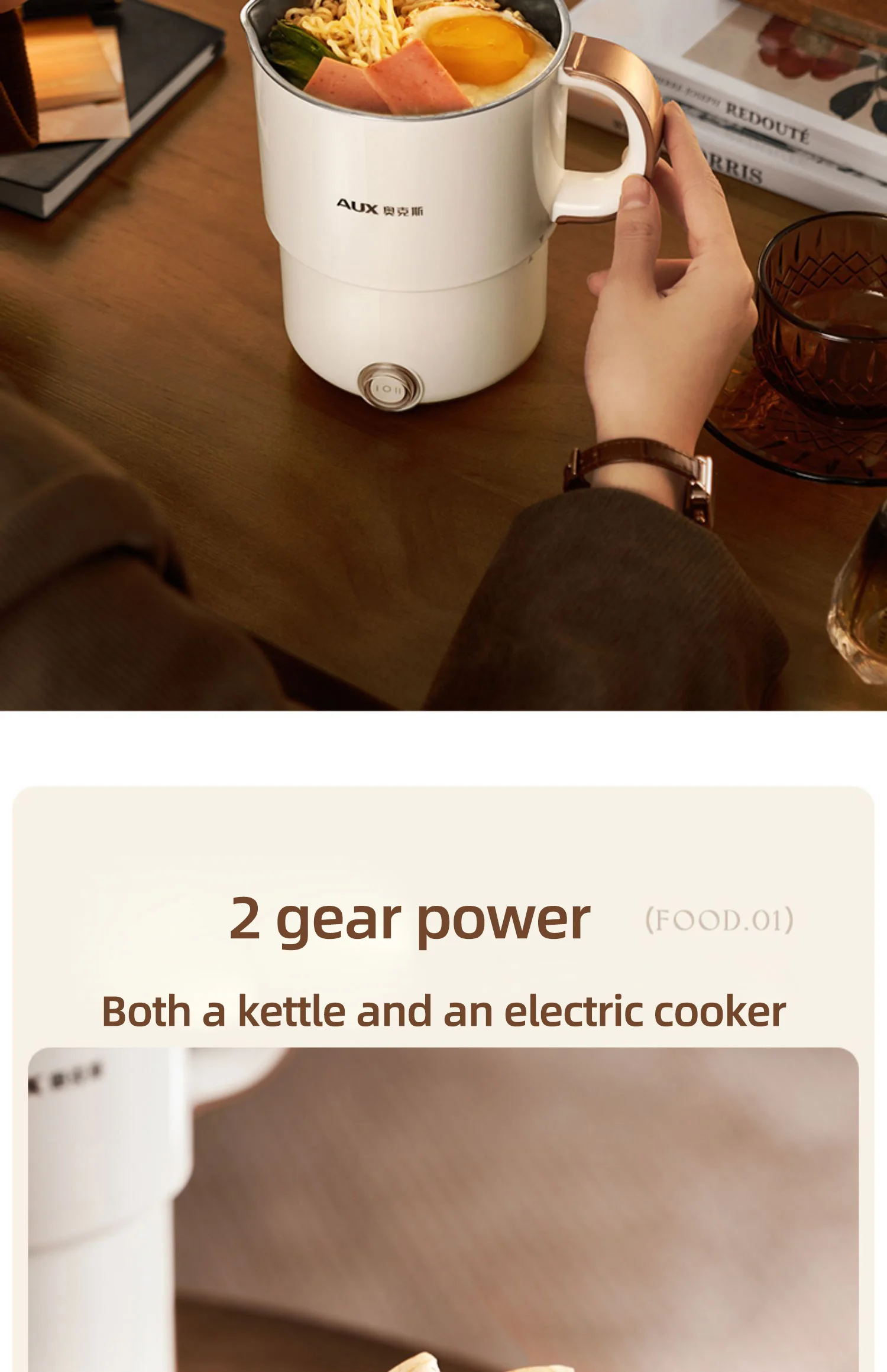 Two-level temperature adjustment - slow cooker and fast cooking, which is both a kettle and an electric cooker. One-key simple and fast cooking, 1st gear 600W, 2nd gear 300W, fast boiling. (The first gear is powered off after boiling, and it will be reheated below 80 degrees, and the second gear is continuous heating to boil sugar water and boil instant noodles)