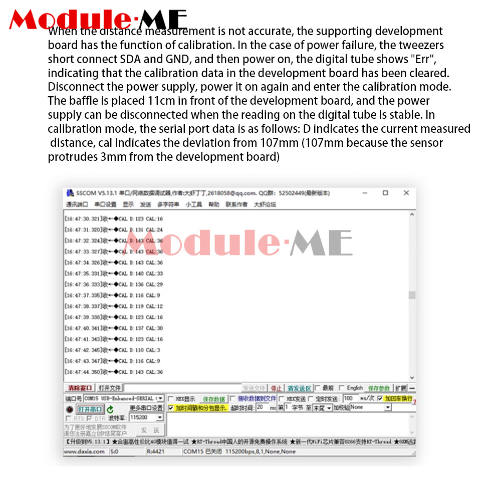 3. When the distance measurement is inaccurate, the supporting development board has a calibration function. In the case of power failure, use tweezers to short SDA and GND, and then power on, the digital tube displays "Err", that is, the calibration data in the development board has been cleared. Disconnect the power supply, power on again to enter the calibration mode. Place a block at 11cm in front of the board, and disconnect the power supply when the reading on the digital tube is stable. In calibration mode, the serial data are as follows: D indicates the current measured distance, cal indicates the deviation from 107mm (107mm because the sensor protrudes 3mm from the board).