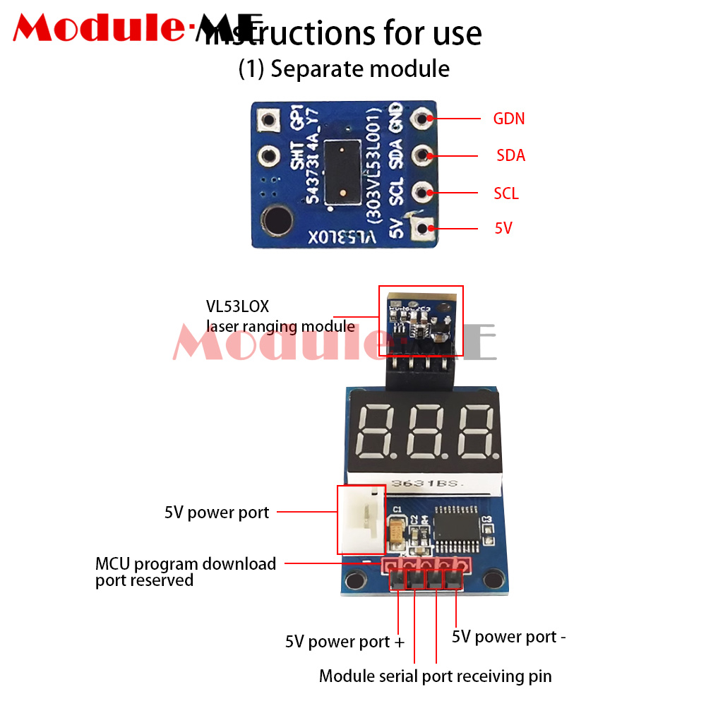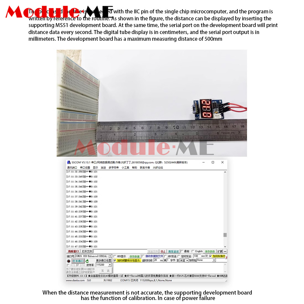 2. Connect the purchased module with your own microcontroller IIC pins and write your own programme with reference to the routine. Insert it into the matching MS51 development board to display the distance. At the same time, the serial port on the development board will print the distance data every second. The digital display is in centimetres and the serial output is in millimetres. The maximum measuring distance of the development board is 500mm.