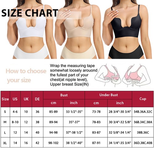 An ultra-comfortable bra that keeps your bust free.Womens Low Back Bra Wire Lifting Deep U Shaped Backless Bra With Convertible Clear Straps Describe Cup: 84% nylon, 16% spandex Buckle closure Convertible Backless Bra :Included Multiway convertible straps and same clear straps, can be worn as low plunge bra, low back bra, backless bra, halter bra, criss-cross back bra, also everyday bra.Perfect low back bras fit backless dress.For halter prom dress or low cut backless dresses as a bridal bra. Deep Plunge Bra: Sexy u-shaped deep plunge bra design,Show charming cleavage. elegant and simple. invisible bra for any deep v necked top.Back single buckle, easy to adjust and wear. Underwire Lifting Bra: Soft and comfy molded cup with underwire, Provide moderate support and nice shape. Adding charming curves. Invisible T-shirt Bra: Low back bras made of smooth and soft fabric.Smoothing seamless molded cup design provides an invisible look under tight dresses and t-shirts. all day comfortable to wear . Size Guide: Sexy low back single buckle adjustable design, give you attractive appearance and no back fat.Please check our size chart picture to confirm your suitable size before buying, any problems, feel free to contact us at the first time.