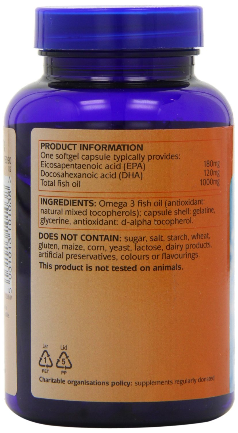 1000mg fish oil, providing 180mg EPA, 120mg DHA.