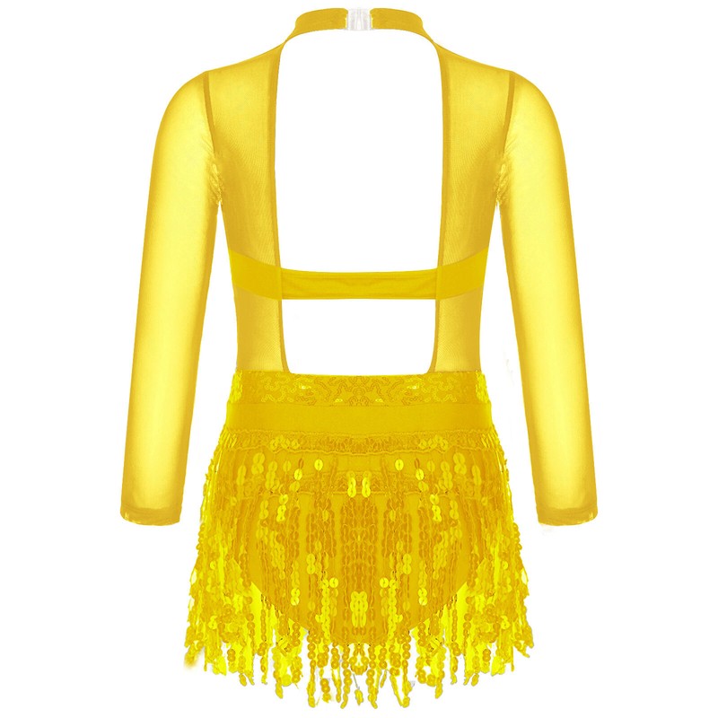 The dress features with spandex mesh long sleeve and round collar, shiny sequins decorated, big hollow back.