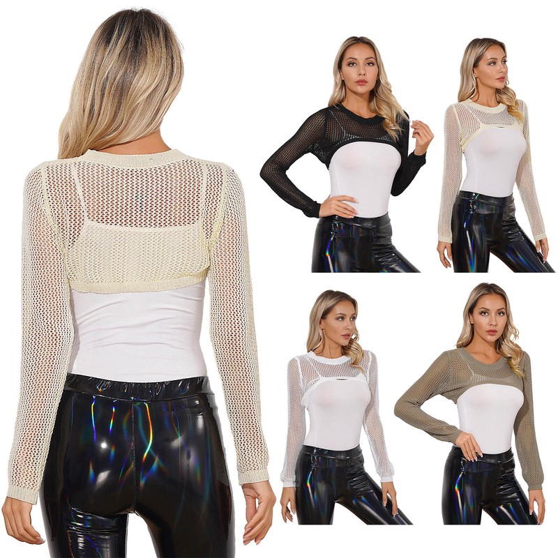 The top with spandex mesh long sleeve and round stand collar, button closure collar back, hollow front and back design.
