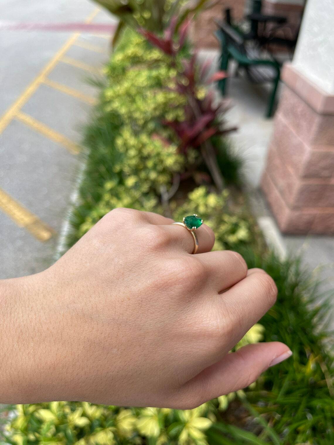 Displayed is a custom emerald solitaire pear-cut engagement/right-hand ring in 14K yellow gold. This gorgeous solitaire ring carries a 2.10-carat emerald in a 4, double prong setting. The emerald has very good clarity with minor flaws that are normal in all genuine emeralds. The gem has a beautiful green color and excellent luster. An ideal solitaire, perfect for everyday use!