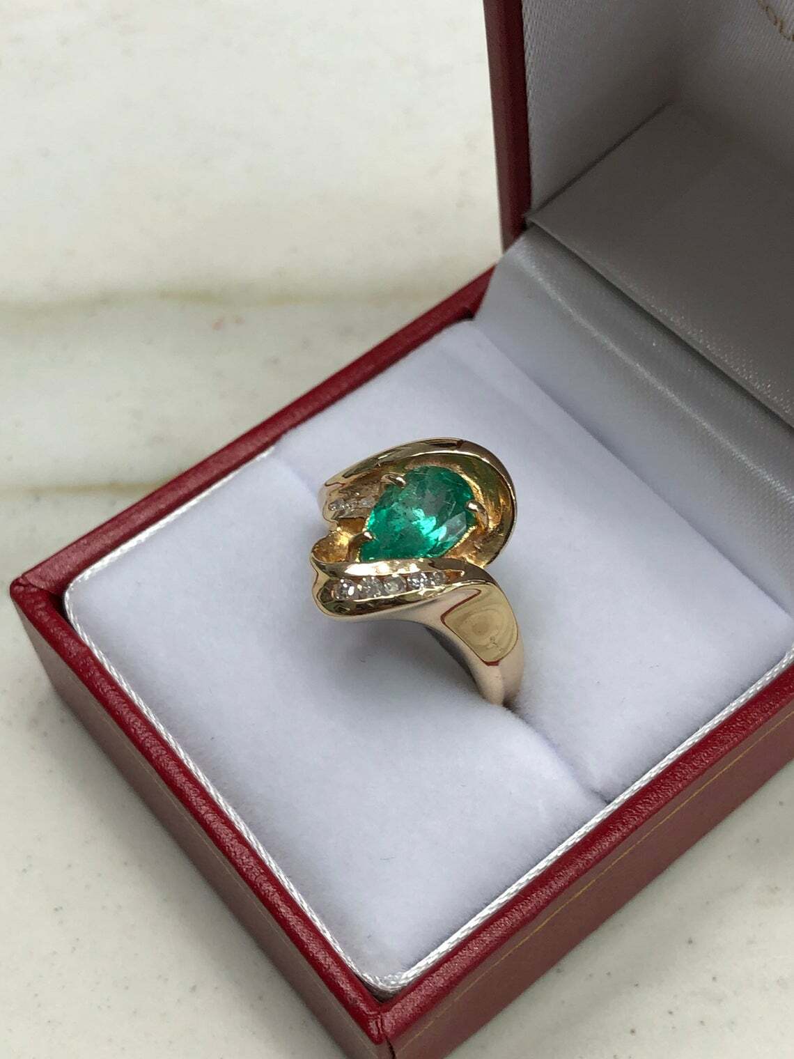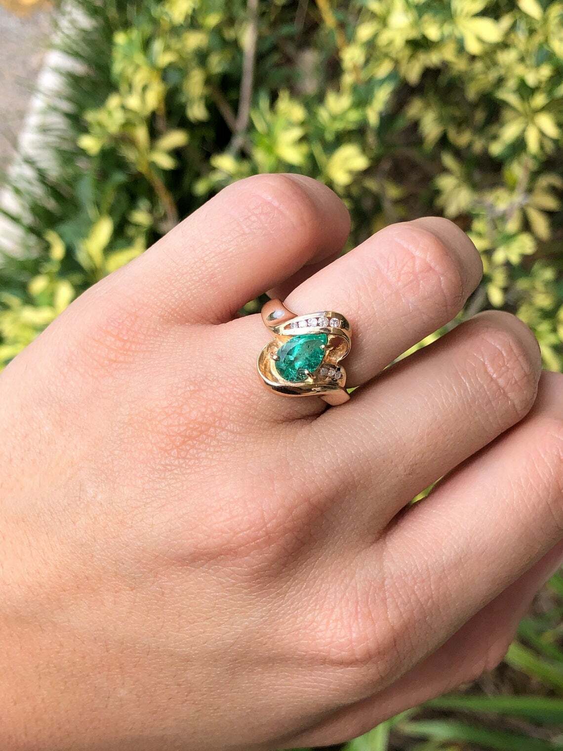 A stunning, pear shape emerald and diamond statement ring, right-hand ring, or just for everyday wear! This gorgeous piece is sure to receive many compliments. An alluring, bluish-green 1.92ct, natural Colombian emerald Emerald cut is nestled in a prong setting. This emerald has a bright green color and has good eye clarity! Eight diamonds are channel set on the sides of the emerald. A simple, smooth, shank is used in this piece.