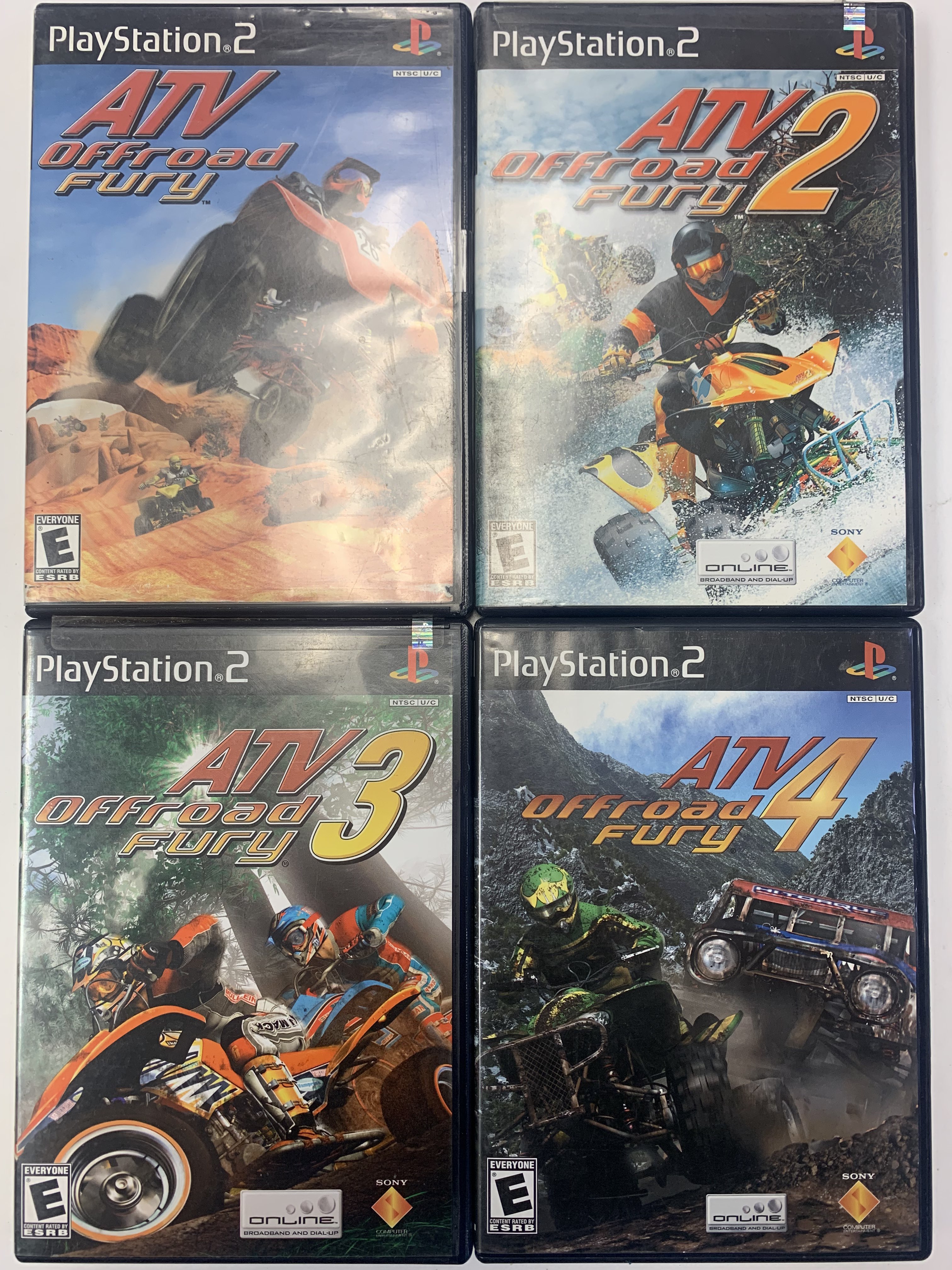 Group of All PS2 ATV Offroad Fury Games: ATV Offroad Fury 1, ATV Offroad Fury 2, ATV Offroad Fury 3, and ATV Offroad Fury 4! Used video games in very good condition. Comes with case with original artwork and game disc. Case may have some wear as it is a used item. Game discs may have been resurfaced. Games have been tested to ensure it works. Will be original Black label version while supplies last, then Greatest Hits will be used.