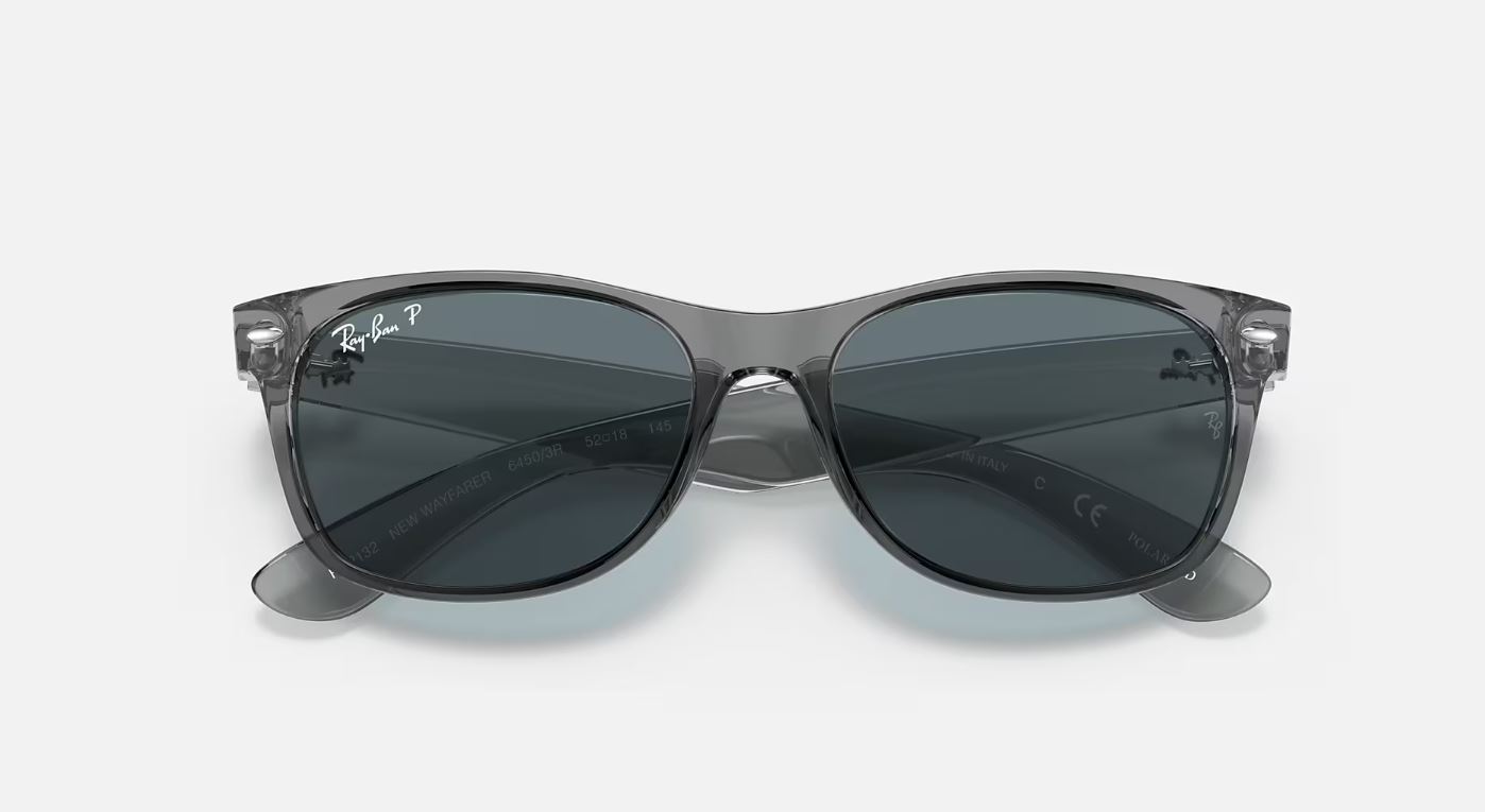 Ray-Ban New Wayfarer Classic Polished Transparent Grey/Dark Blue Polarized 58mm Sunglasses RB2132 64503R 58-18