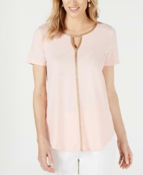 Sparkling metallic trim at the keyhole neckline and front elevates this short-sleeve top from Jm Collection.