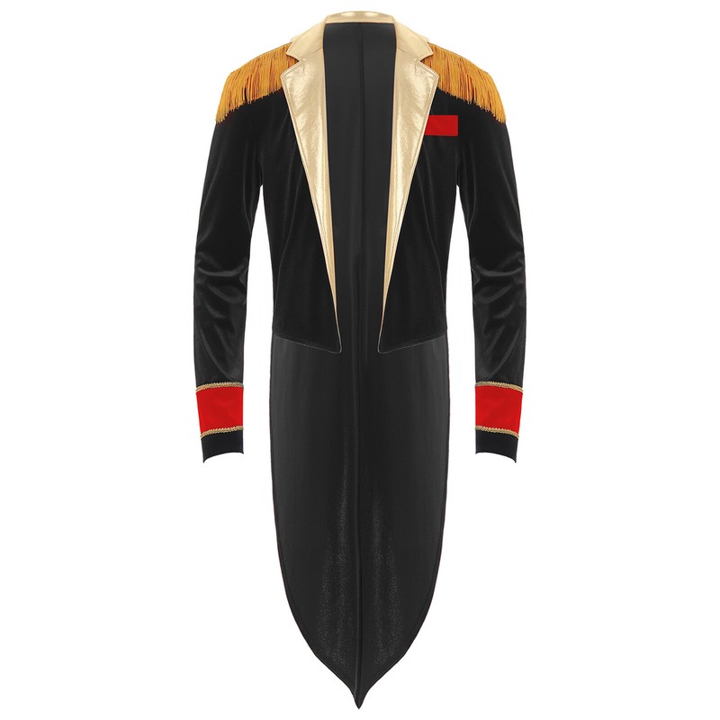 Circus tailcoat for men, black velvet cuffs with gold braid trim, metallic shiny lapel collar, tassel epaulets.
