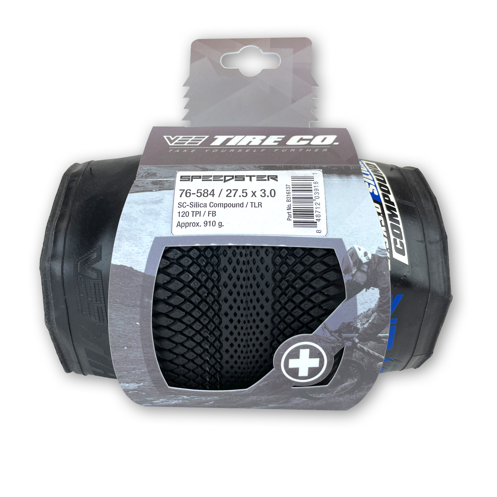 Vee Tire's 27.5x3.0 Speedster bike tire is at the top of its class! This tire has the Silica compound for increased traction, is tubeless ready for those who run a tubeless set up and a folding bead for convenience. The Speedster is designed for rolling speed and minimal drag on hard-pack or paved terrain. The honeycomb center tread provides virtually zero rolling resistance and unbelievable tread life. This feature also gives you excellent traction in dry or wet conditions. Large diamond shaped side knobs provide the grip you need in corners, while the tread knobs get smaller towards the center for the ultimate speed and traction. And with its balloon-style structure, you will feel like you are floating on air.