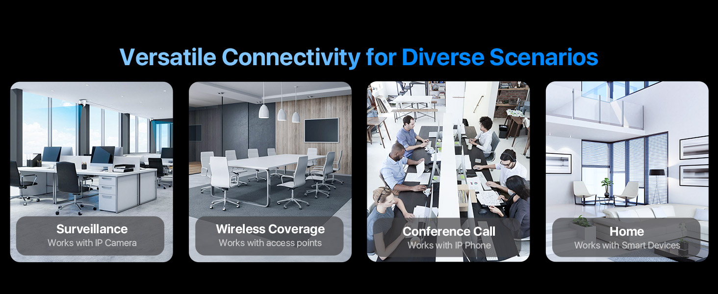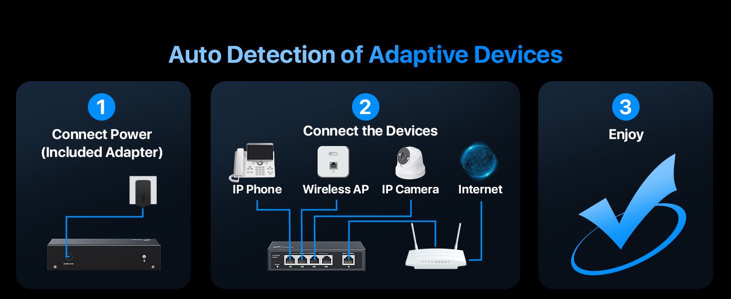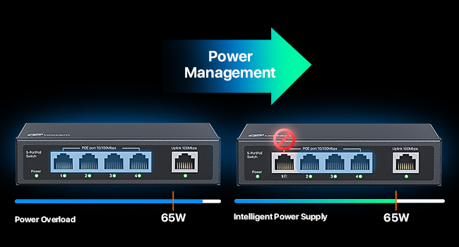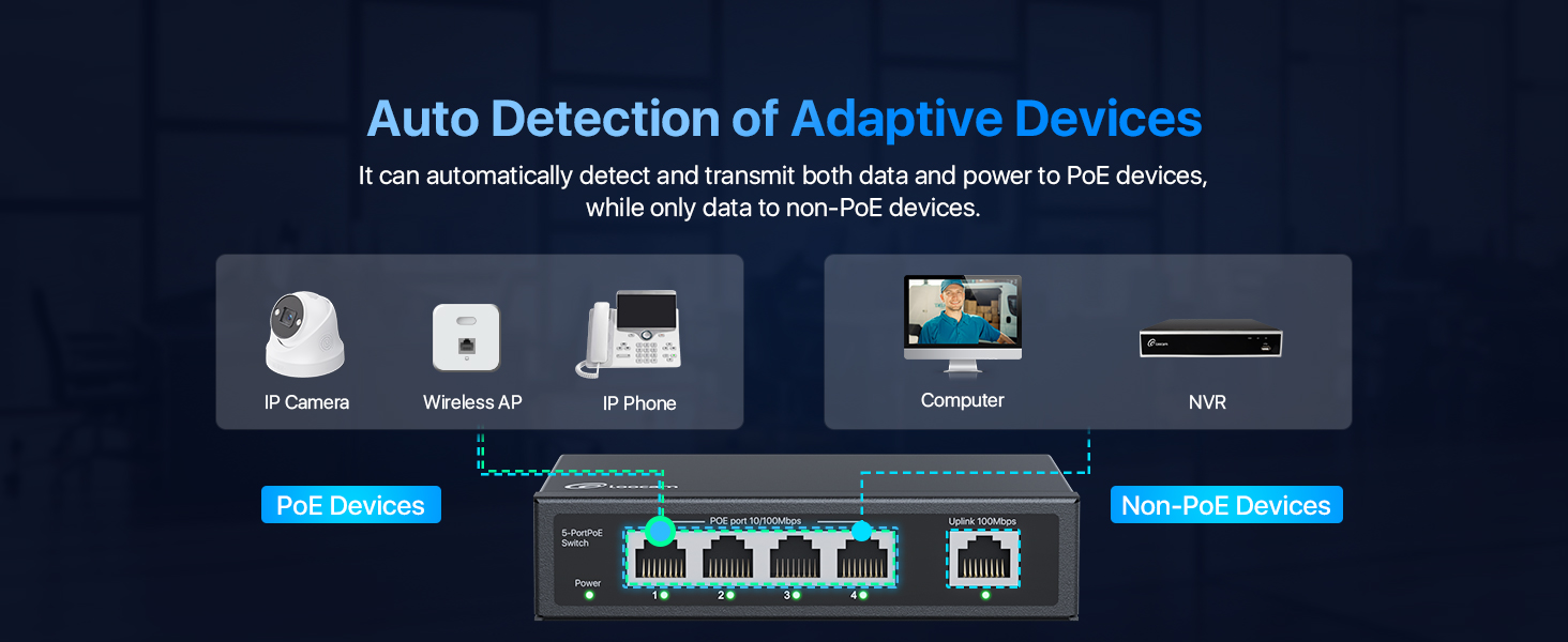 This 5 port poe switch supports power overload protection that can cut lower priority port’s power and PD detection that can detect PoE/non-PoE devices to provide the required power for your PoE devices.